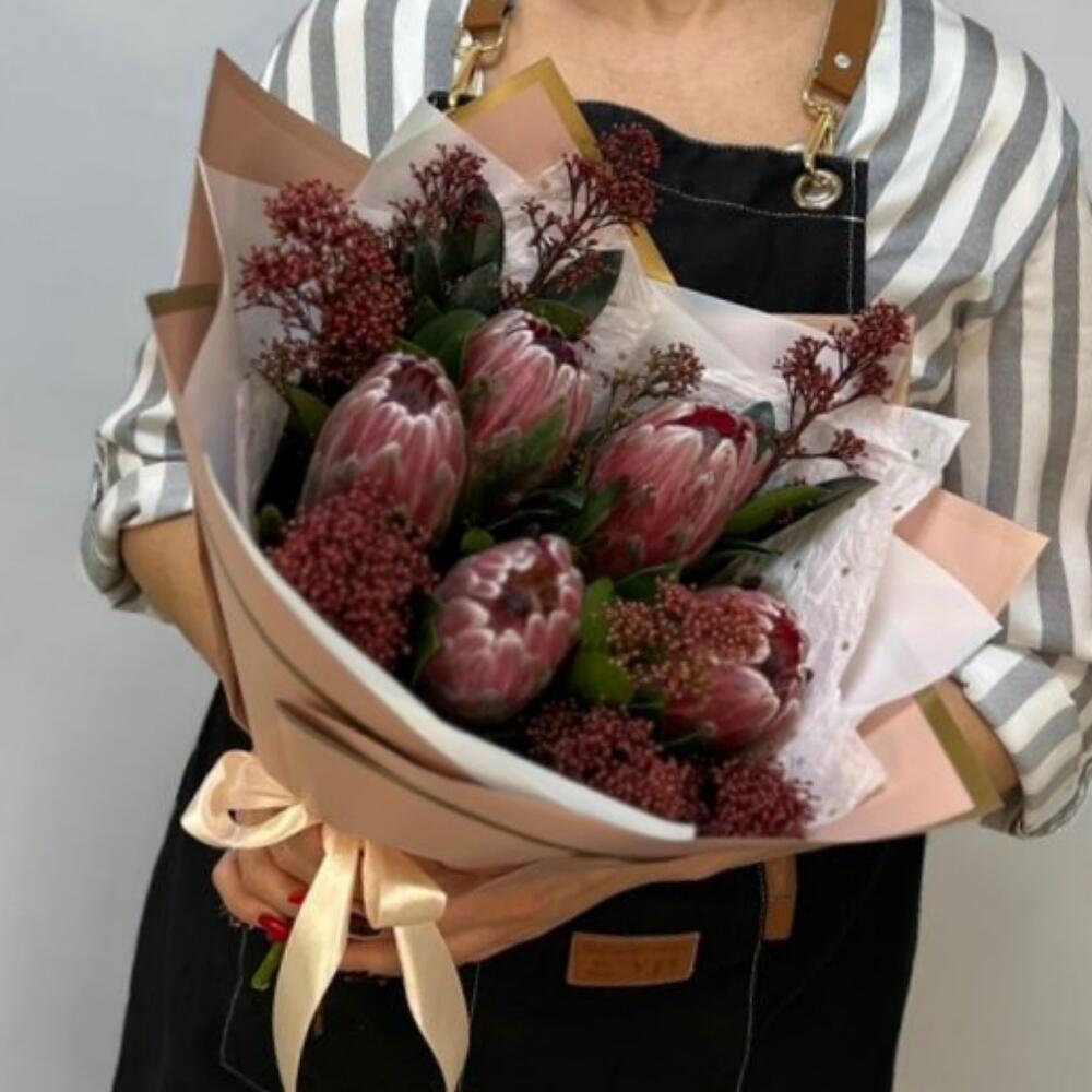 Прекрасный, экзотический и очень стойкий букет из протеи и скимии! Отлично подойдёт для коллеги, и близкого человека. Букет хорошо смотрится в качестве основного подарка, и может быть как дополнение к основному подарку.