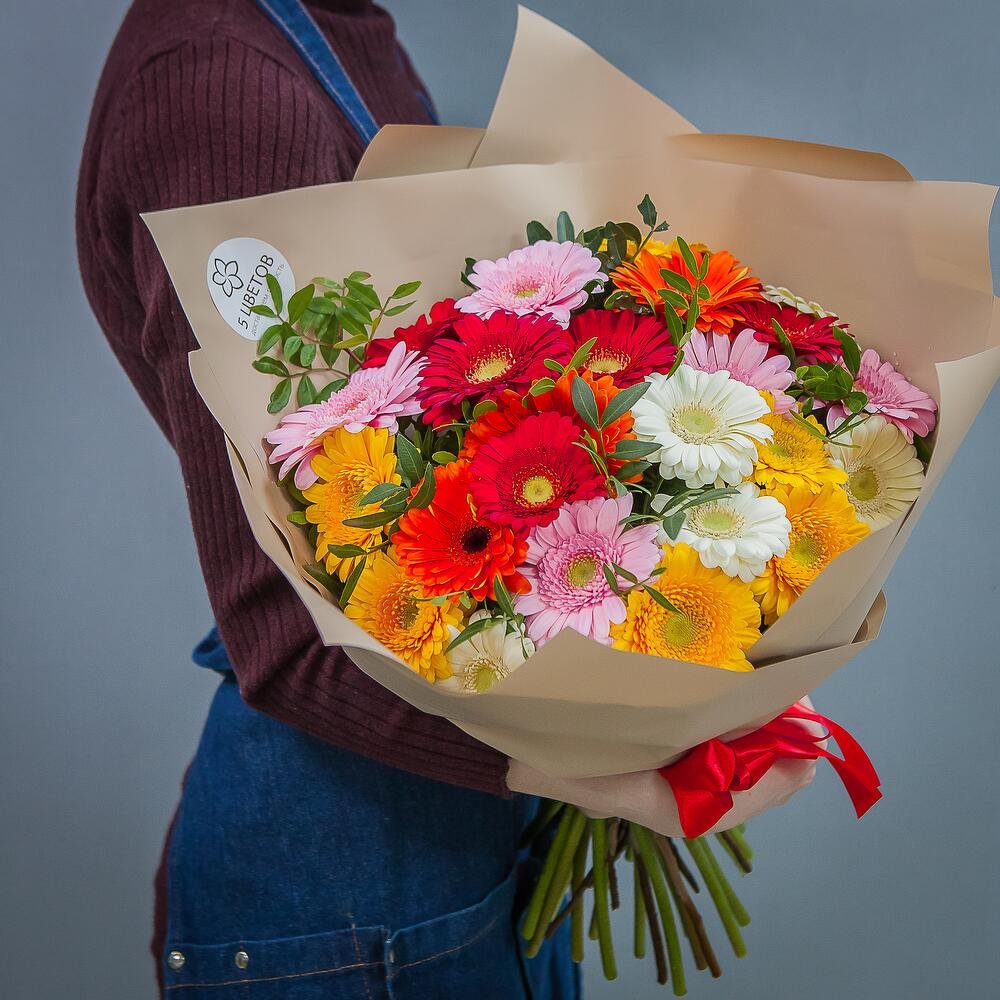 Гербера желтая – 5 шт.Гербера красная – 5 шт.Гербера розовая – 5 шт.Гербера белая – 5 шт.Гербера кремовая – 3 шт.фиолетовая – 2 шт.
