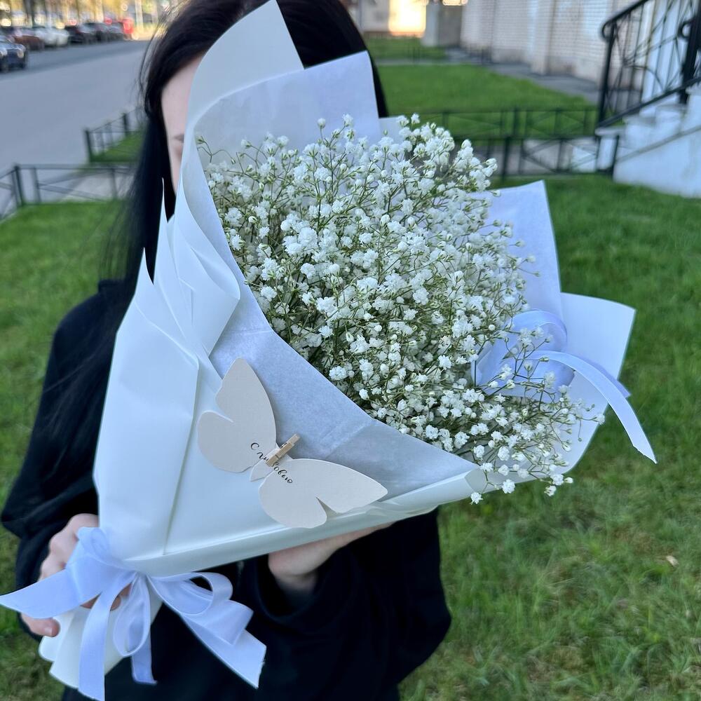 Гипсофила – 7 шт.Лента атласная – 1 шт.Пленка матовая – 1 шт.Открыточка с вашими пожеланиями – 1 шт.