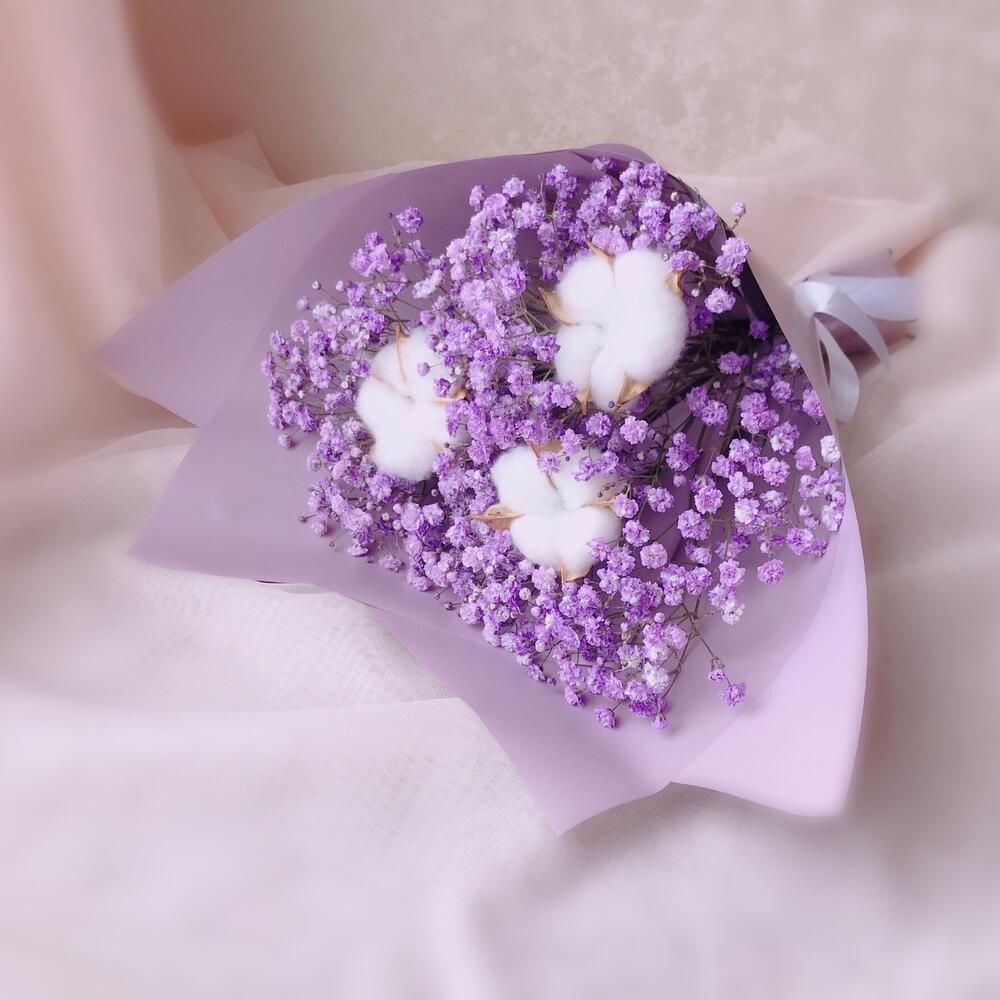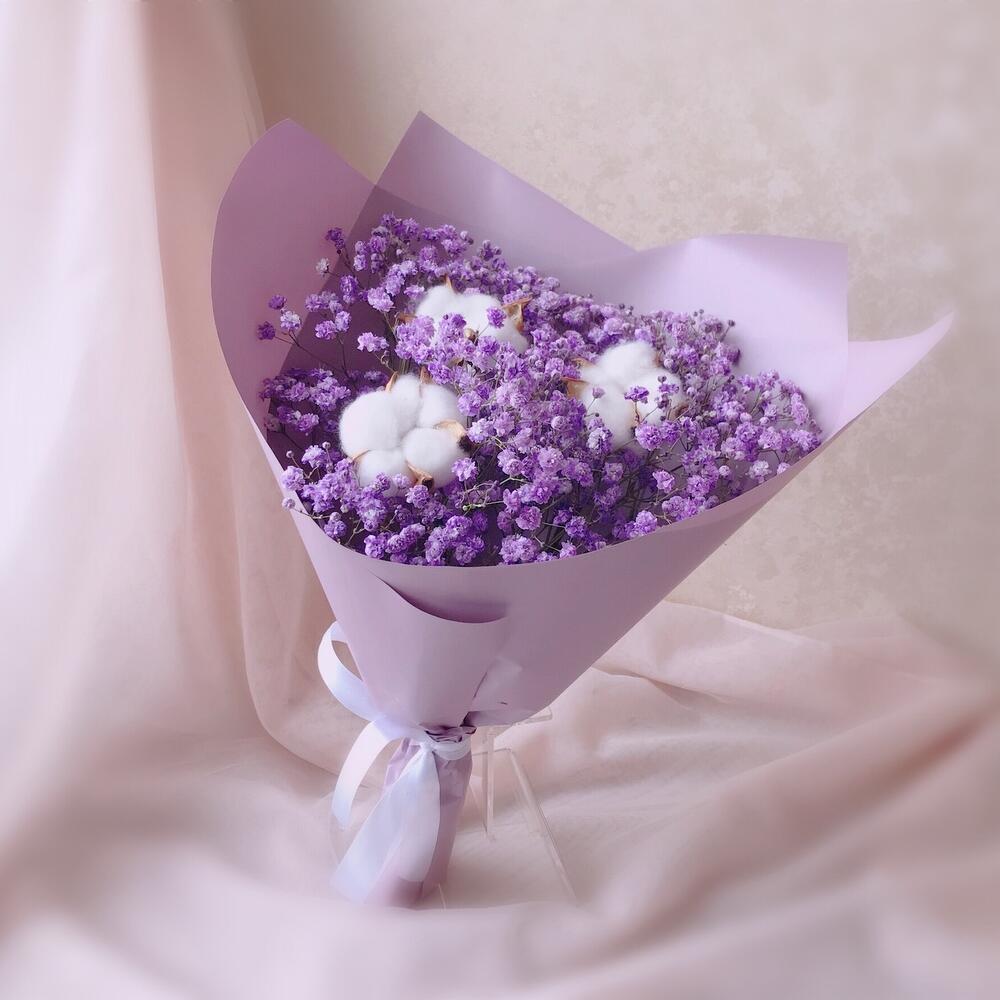 Хлопок – 3 шт.Лента атласная – 1 шт.Упаковка дизайнерская – 1 шт.Гипсофила фиолетовая – 3 шт.