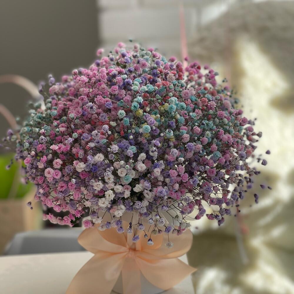 “Сиреневый туман” – композиция из гипсофилы в шляпной коробке