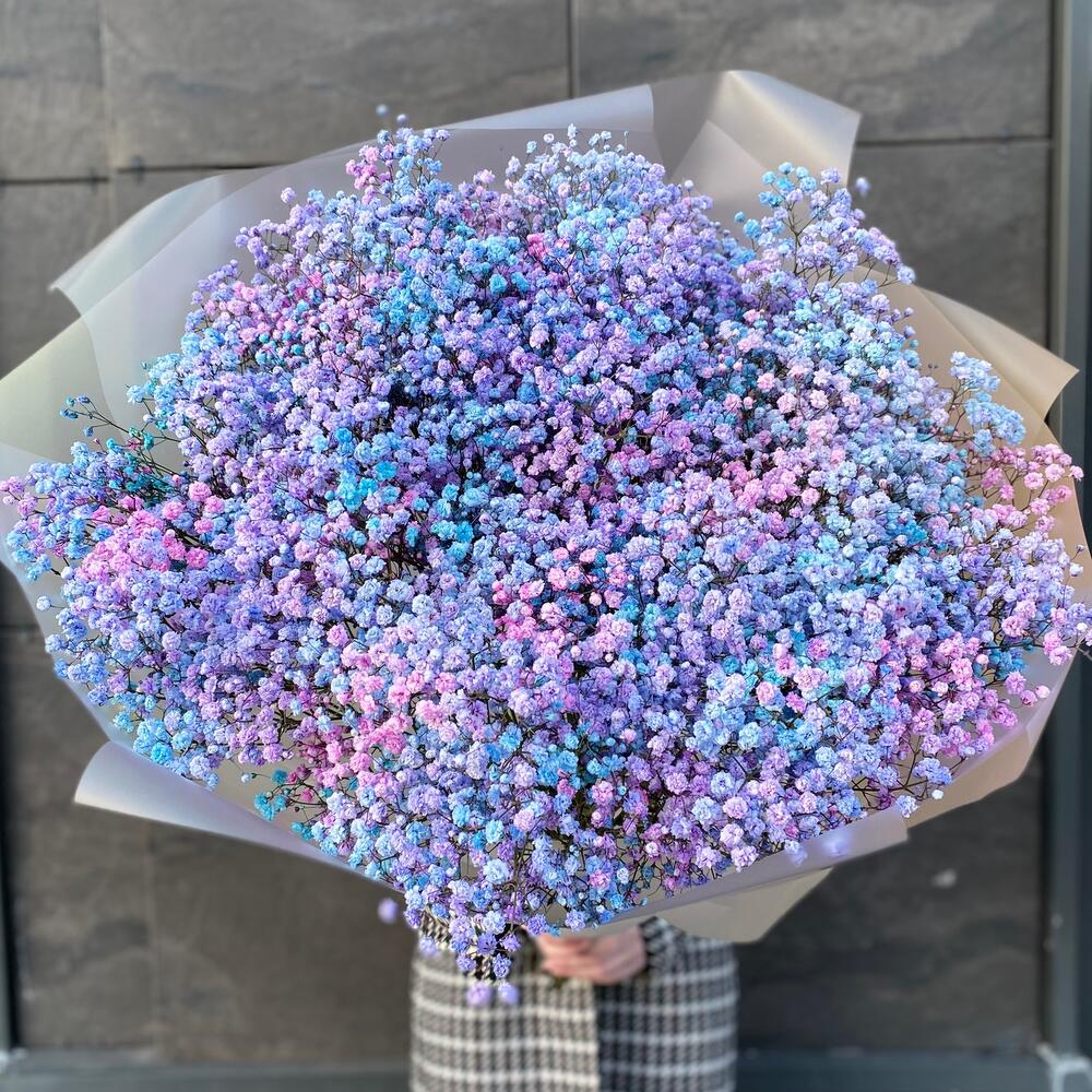Лента атласная – 1 шт.Упаковка дизайнерская – 3 шт.гипсофила радужная – 25 шт.
