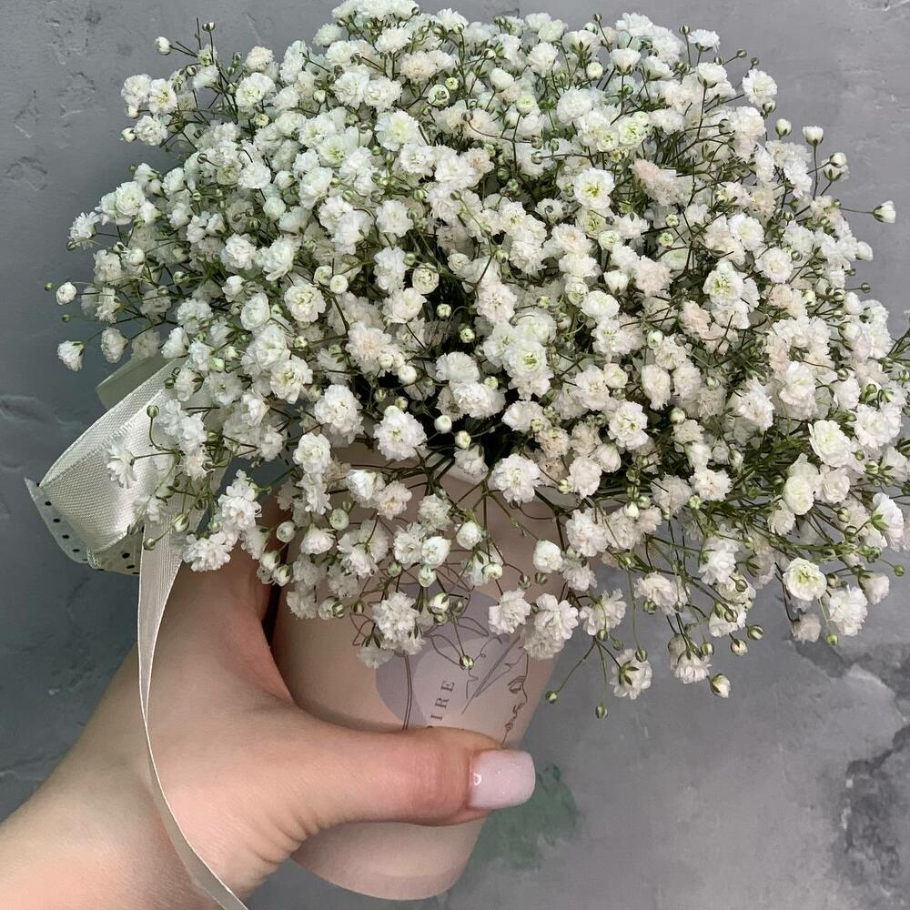 Стаканчик с гипсофилой – отличный вариант презента или дополнения к основному подарку, или просто без повода)Небольшую композицию удобно разместить дома, на работе, так как не требуется ваз)Стаканчик будет долго радовать своей красотой и нежностью и дарить только положительные эмоции