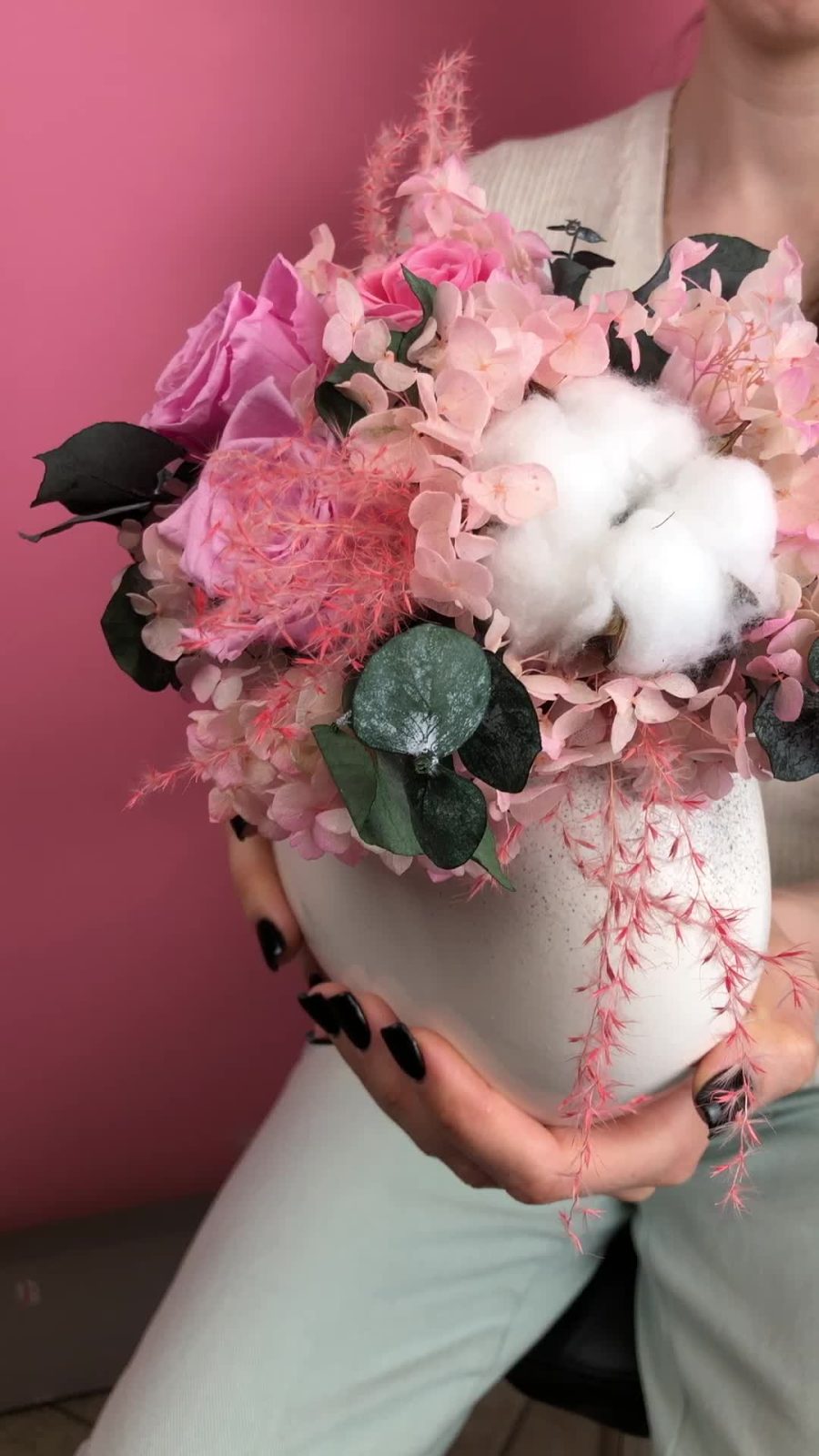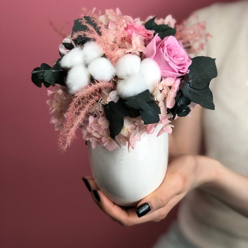 Хлопок – 3 шт.Керамическая ваза – 1 шт.гортензия стабилизированная – 15 шт.стабилизированные цветы микс – 5 шт.