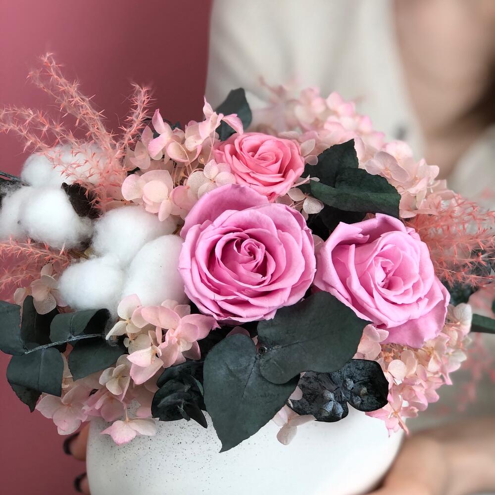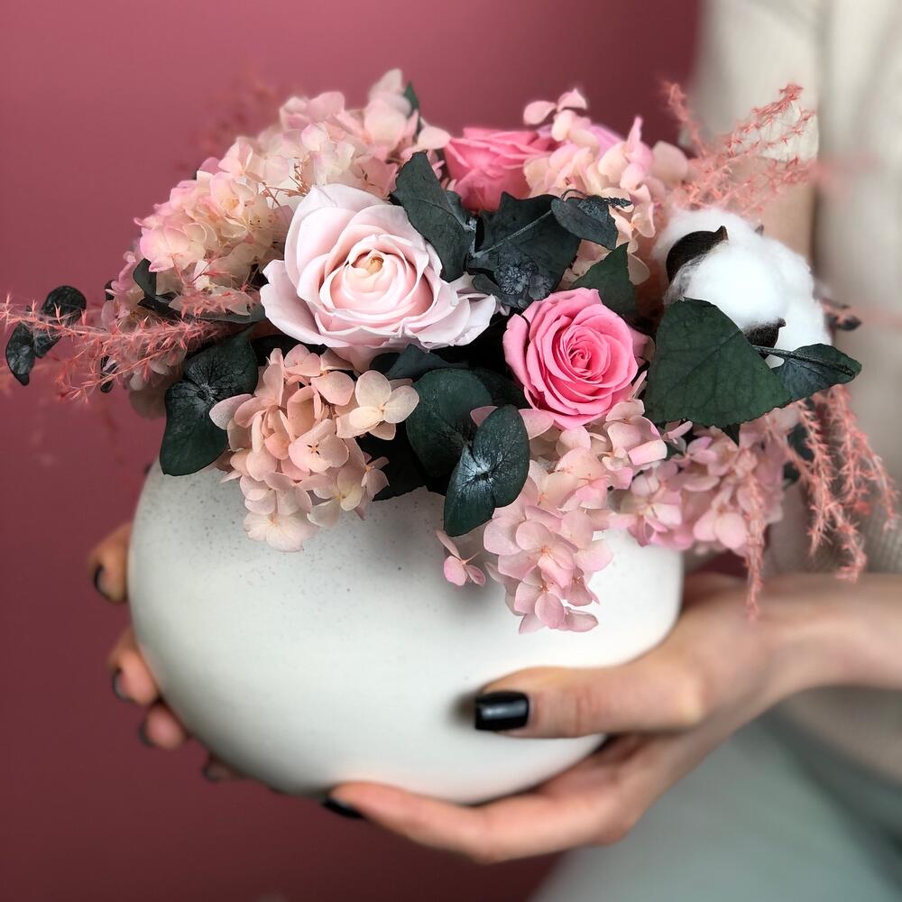 Композиция авторская из стабилизированых цветов. Ваза керамическая.Не требует ухода и полива, срок жизни 5-7 лет при соблюдении рекомендаций.
