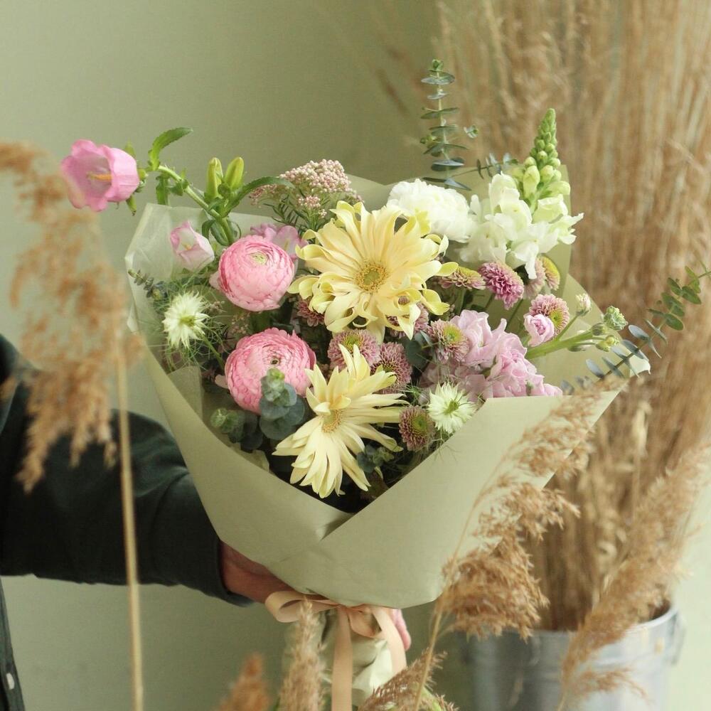 гербера кудрявая – 2 шт.Ранункулюс – 2 шт.Колокольчик – 1 шт.Маттиола – 1 шт.Львиный зев – 1 шт.Озотамнус – 1 шт.тмин – 2 шт.Диантус – 2 шт.Эвкалипт – 3 шт.Упаковка – 1 шт.