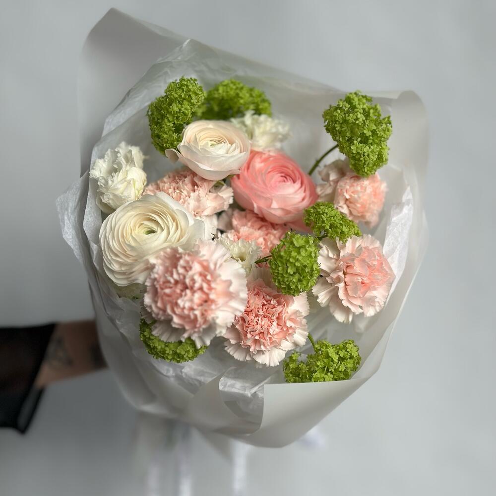 Ранункулюс – 3 шт.Вибурнум – 2 шт.Гвоздика – 6 шт.эустома белая – 2 шт.