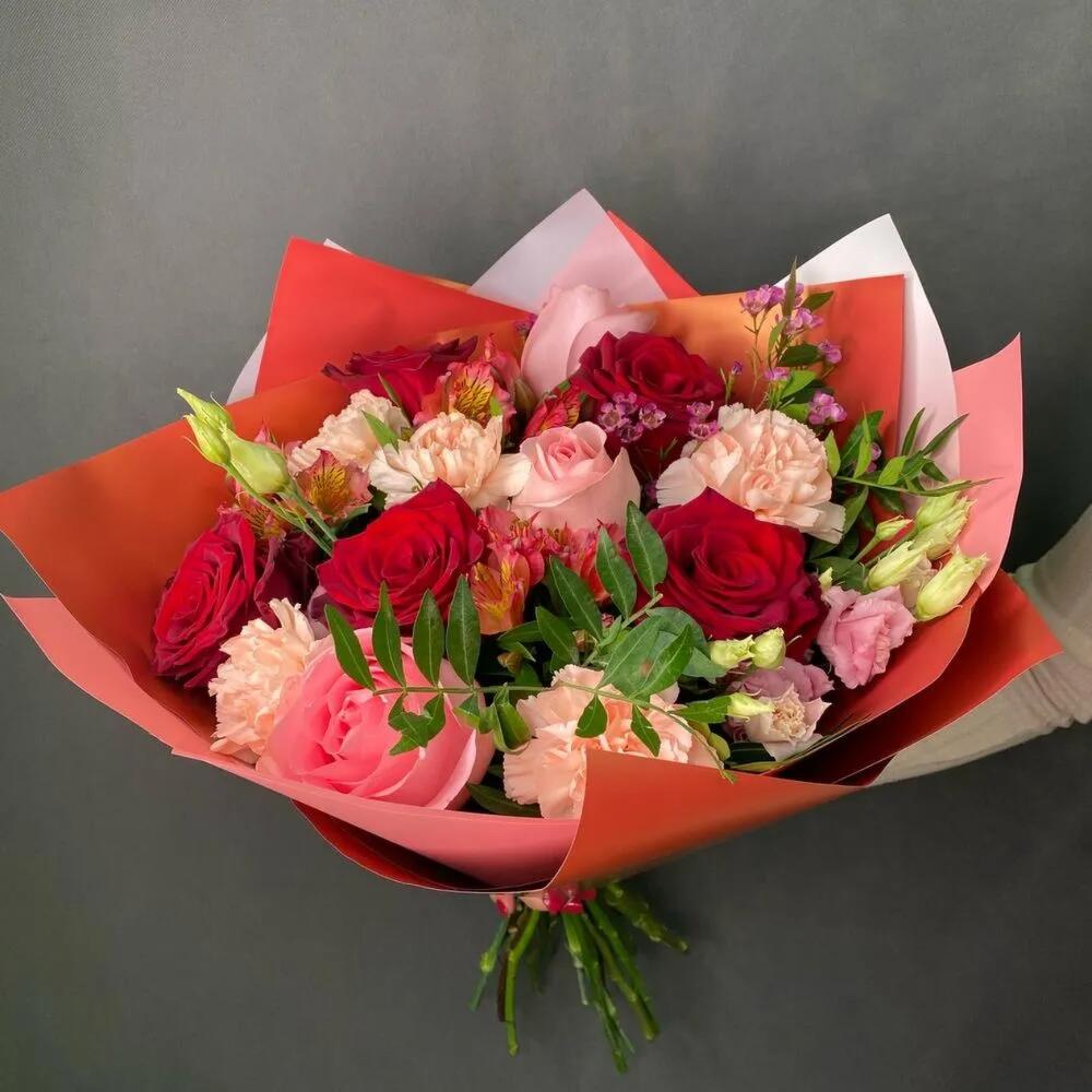 Категории: АльстромерииРозы, Гвоздики, Лизиантусы