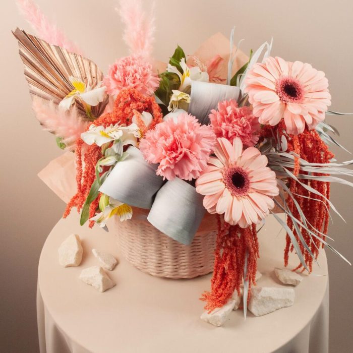 Корзина – 1 шт. Альстромерия – 2 шт. Амарант – 1 шт. Аспидистра – 2 шт. Гвоздика одноголовая – 3 шт. Гербера – 2 шт. Оазис – 1 шт. пальмовое копье – 1 шт. пампас мини – 2 шт. Фисташка – 1 шт.