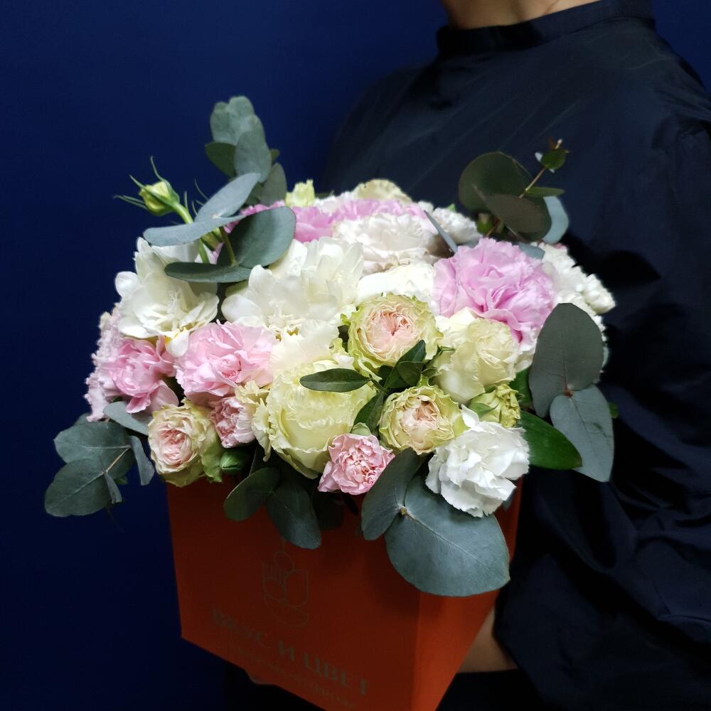 Альстромерия – 2 шт.Лизиантус – 3 шт.Диантус – 3 шт.Диантус кустовой – 2 шт.сочная зелень – 5 шт.Брендированная коробка – 1 шт.Роза кустовая – 1 шт.
