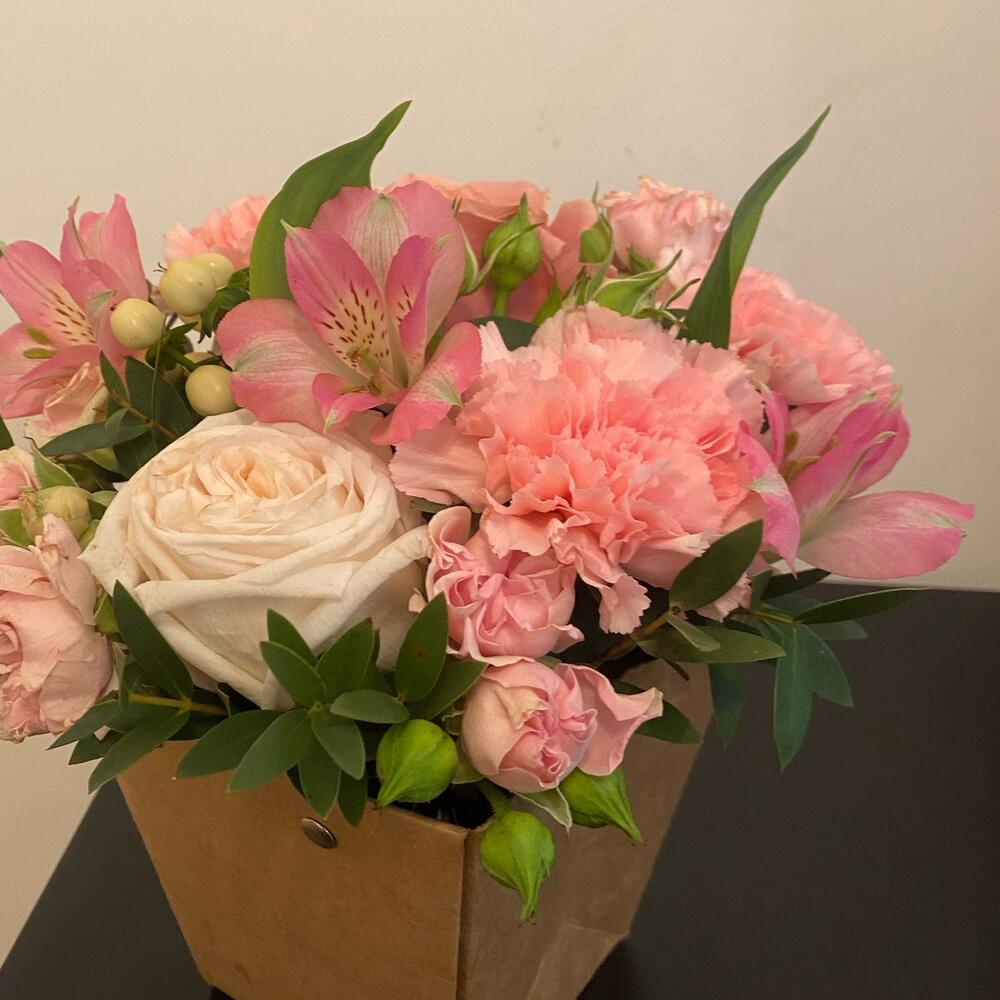 Альстромерия – 2 шт.Роза кустовая – 3 шт.Роза – 1 шт.Зелень – 11 шт.Роза пионовидная – 1 шт.Сумочка – 1 шт.Оазис флористический – 1 шт.Диантус сортовой – 3 шт.ирингум – 1 шт.