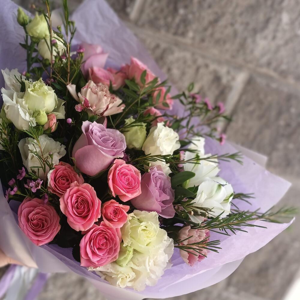 Категории: АльстромерииРозы, Гвоздики, Кустовые розы, Лизиантусы