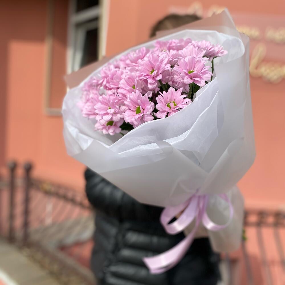 Лента атласная – 1 шт. Тишью – 1 шт. Ромашковая хризантема – 5 шт. Дизайнерская упаковка – 1 шт.
