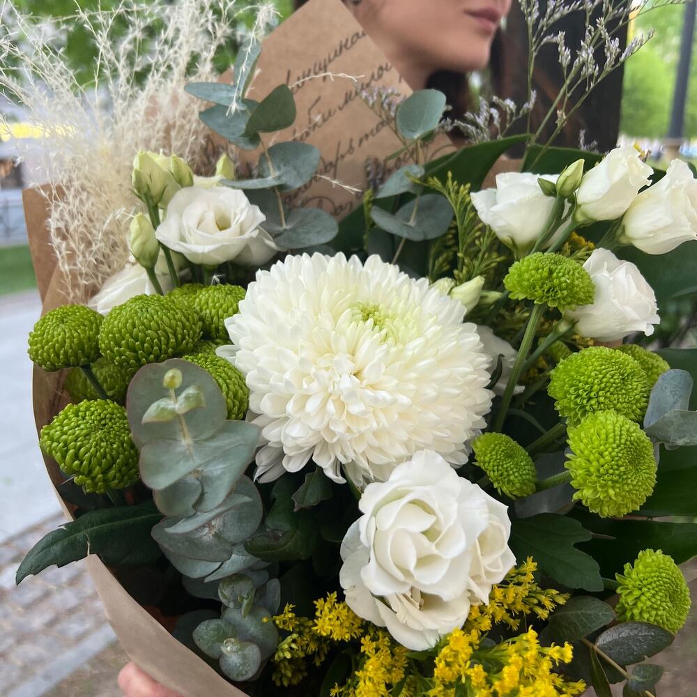 Хризантема – 1 шт.Хризантема кустовая – 2 шт.Солидаго – 2 шт.Лизиантус – 2 шт.Эвкалипт – 1 шт.Зелень – 1 шт.Лимониум – 1 шт.Сухоцвет – 1 шт.Упаковка дизайнерская – 1 шт.
