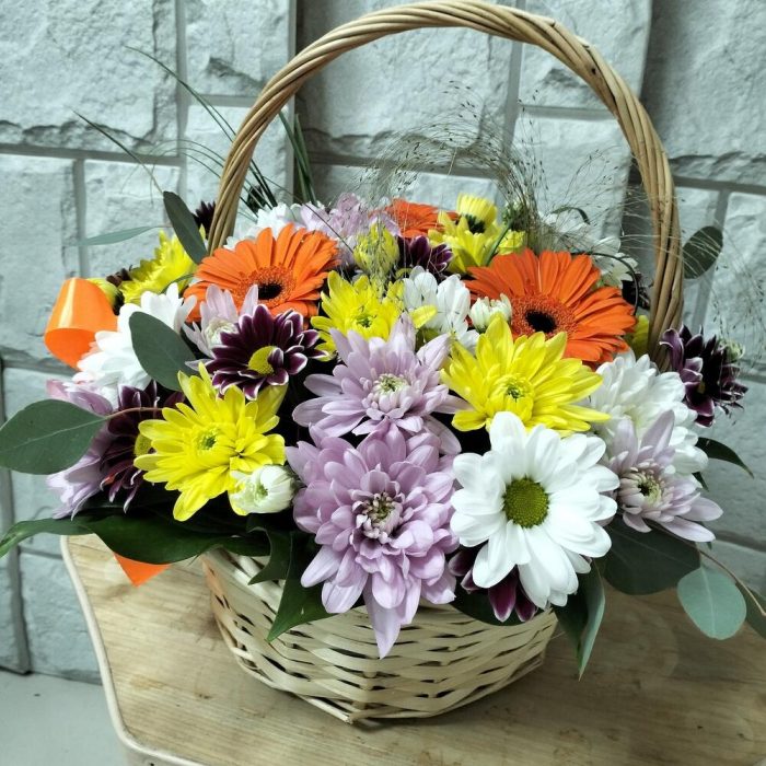 Эвкалипт – 2 шт.Лента атласная – 1 шт.Гербера мини – 3 шт.Оазис флористический – 1 шт.Хризантема кустовая микс – 5 шт.корзина плетенная средняя – 1 шт.Паникум Фонтан – 1 шт.