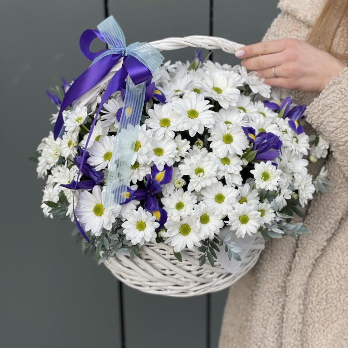 Хризантема – 11 шт. ирисы – 9 шт. Писташ – 6 шт. Корзина – 1 шт. Оазис – 2 шт. Оформление – 1 шт.