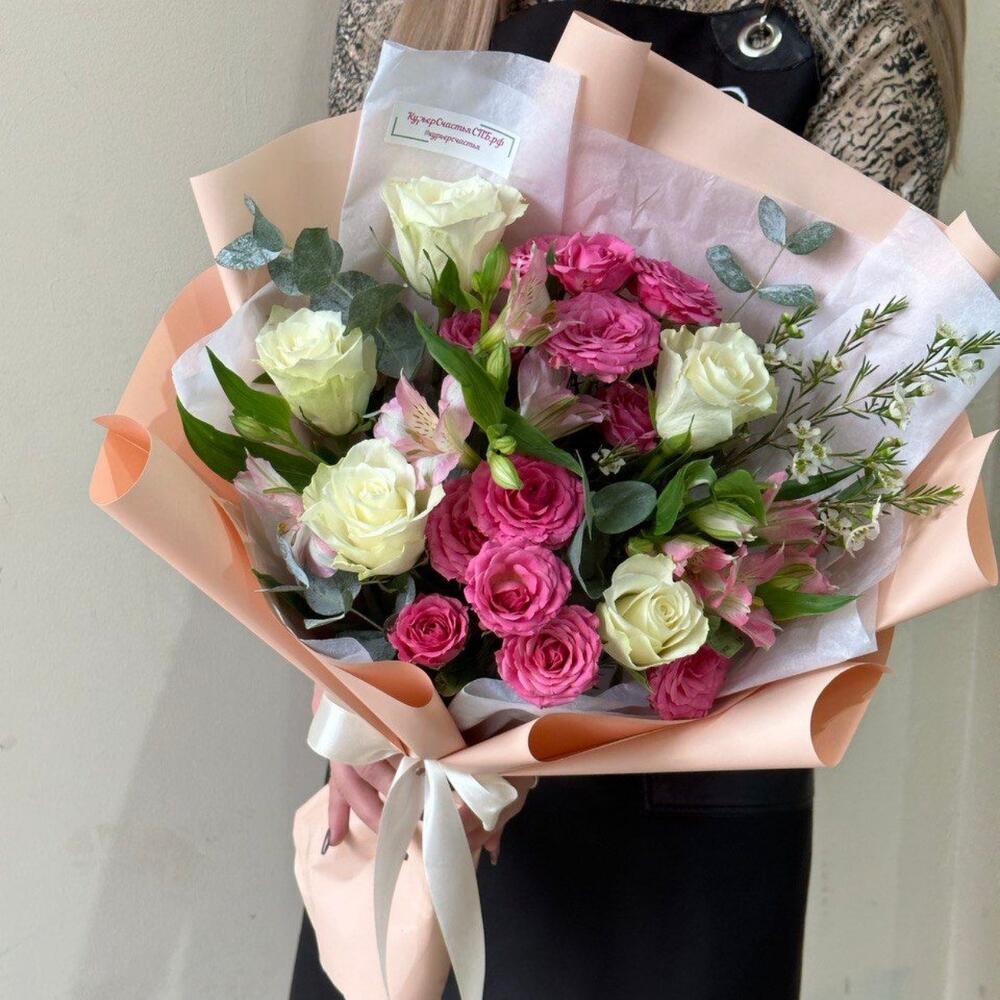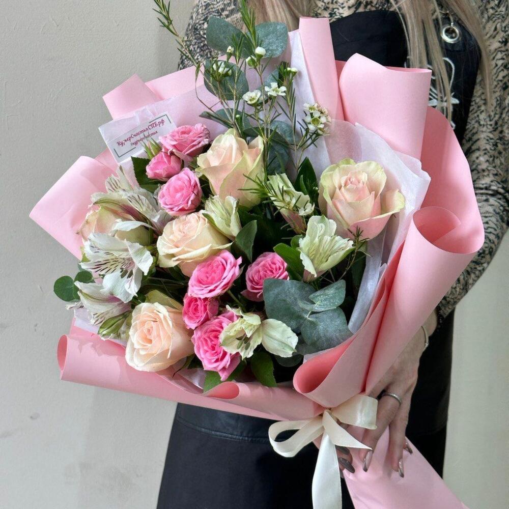Букет роз , альстромерий и эвкалипта в дизайнерской упаковке