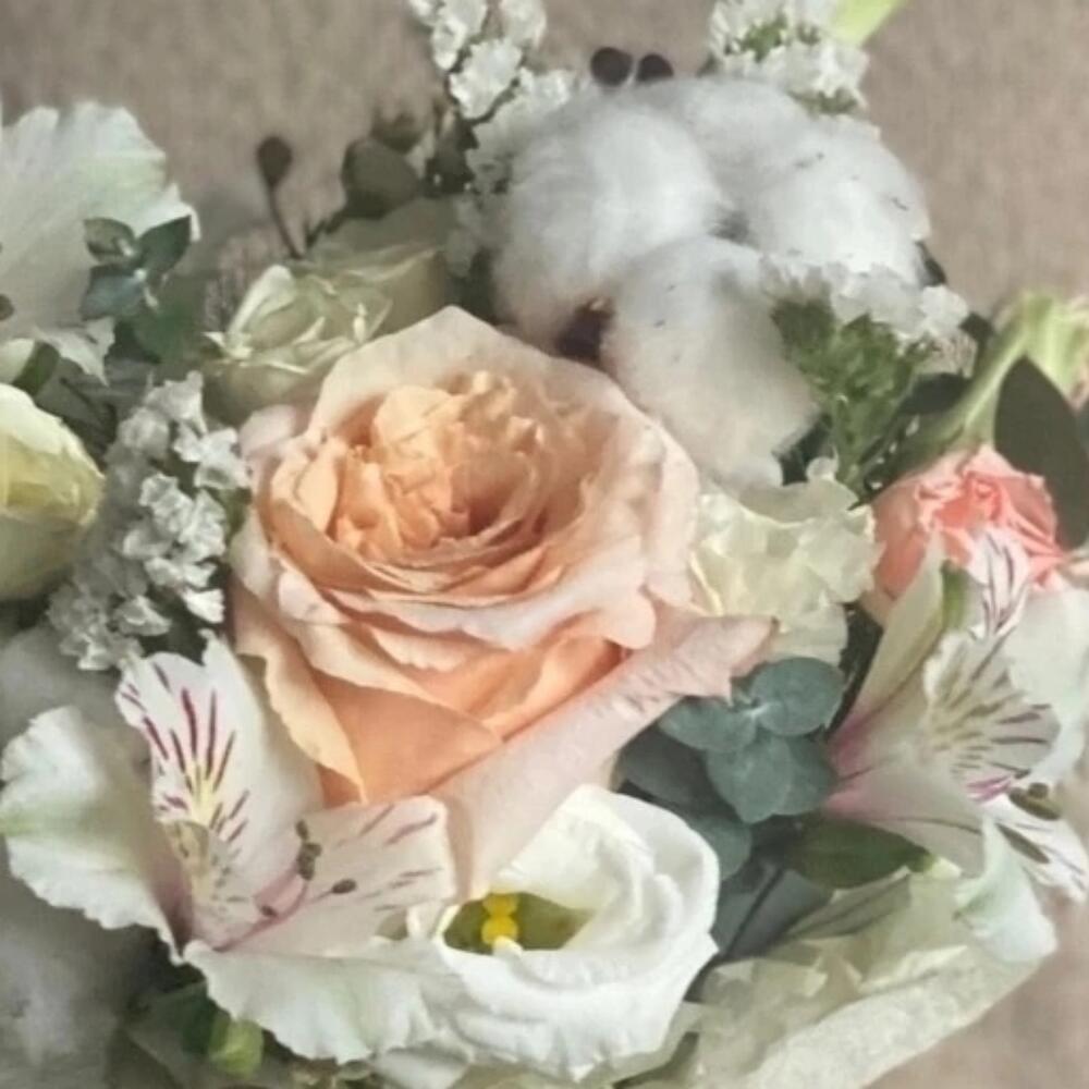 Роза – 1 шт.Кустовая роза – 3 шт.Альстромерия – 3 шт.Хлопок натуральный – 3 шт.Лизиантус – 2 шт.Статица – 1 шт.Эвкалипт – 1 шт.Шляпная коробка – 1 шт.Оазис флористический – 1 шт.