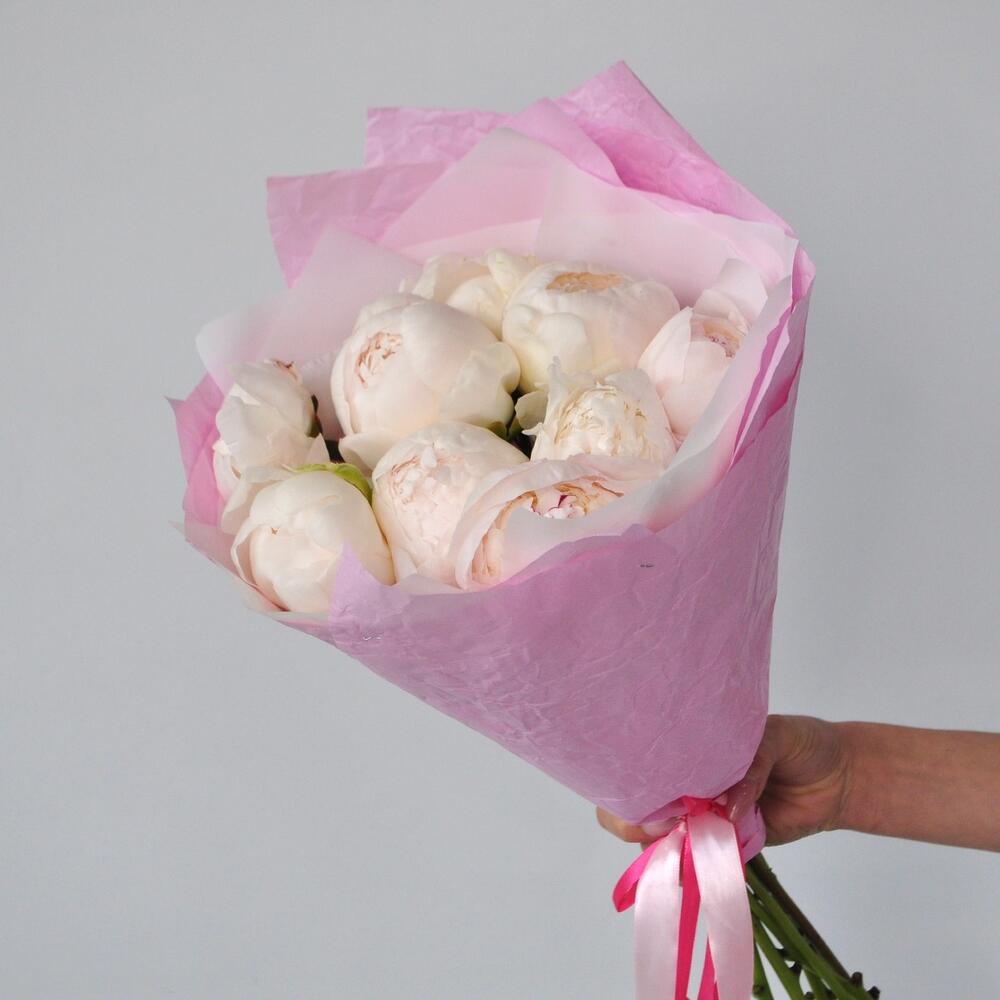 Лента атласная – 1 шт.Пион белый – 9 шт.Упаковка дизайнерская – 2 шт.