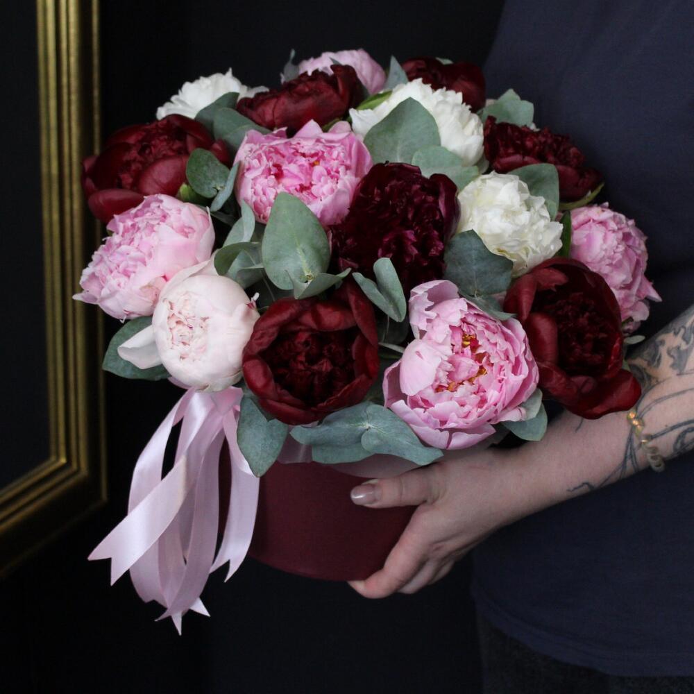 Пион Сара Бернар – 5 шт.Пион Ред Шарм – 6 шт.Пион белый – 4 шт.Оазис флористический – 1 шт.Шляпная коробка – 1 шт.Лента атласная – 2 шт.Эвкалипт Baby Blue – 5 шт.