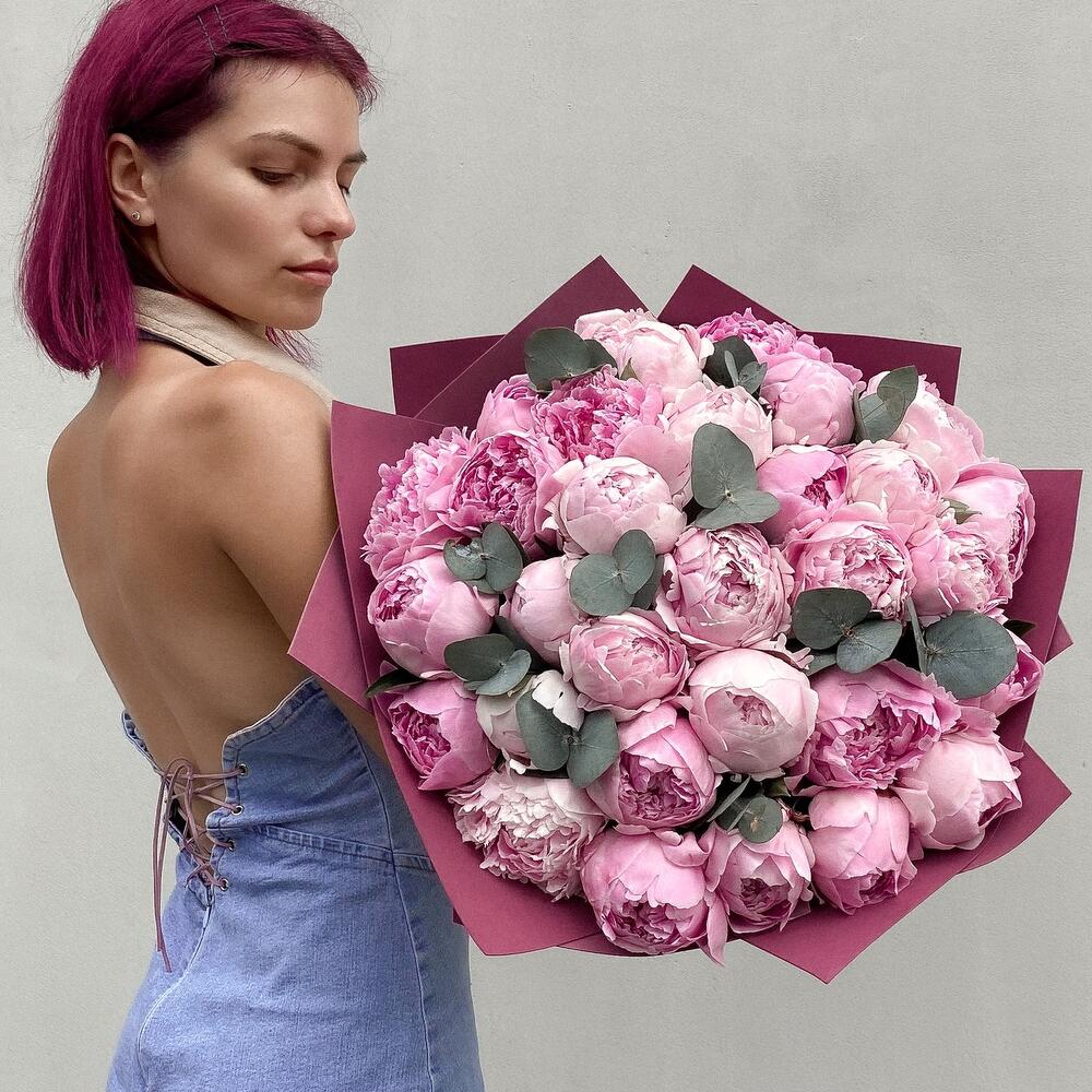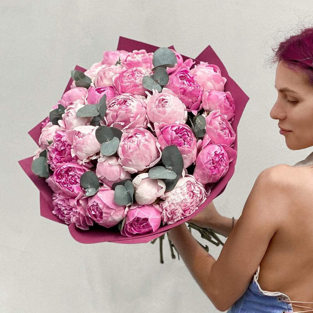 Пион Сара Бернар – 31 шт.эвкалипт синерея – 2 шт.