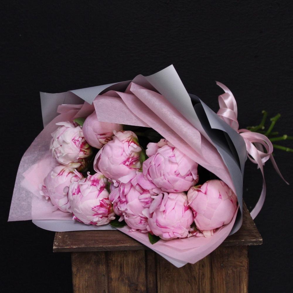 Лента атласная – 2 шт.Пион Сара Бернар – 9 шт.Пленка дизайнерская – 2 шт.