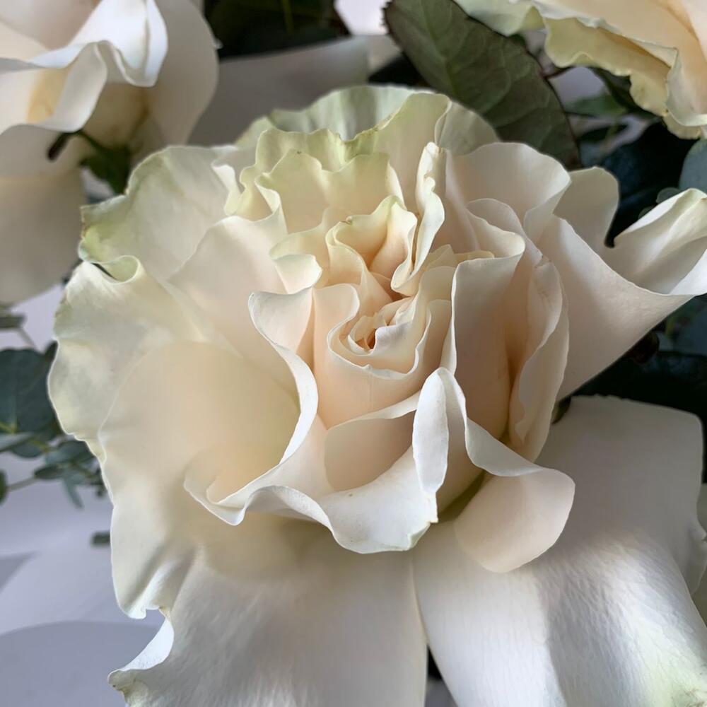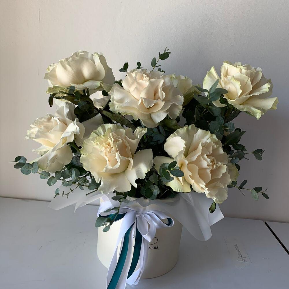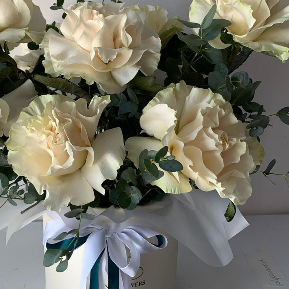 Эвкалипт – 6 шт.Коробка – 1 шт.Роза французская – 7 шт.Оазис флористический – 1 шт.