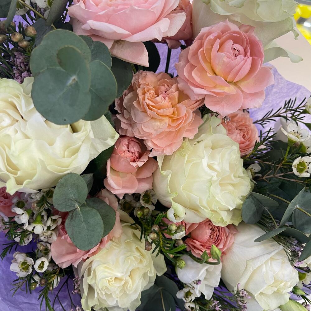 Роза Мондиаль – 5 шт.кустовая роза джульетта – 3 шт.Лимониум – 3 шт.Ваксфлауэр – 3 шт.Эвкалипт – 4 шт.Лизиантус – 1 шт.Упаковка дизайнерская – 2 шт.