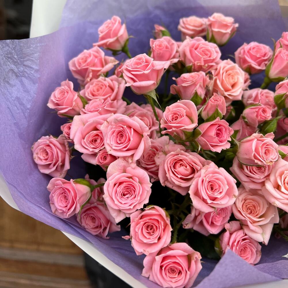 Роза кустовая 60 см – 11 шт.дизанерская упаковка – 3 шт.Тишью – 1 шт.Лента атласная – 1 шт.