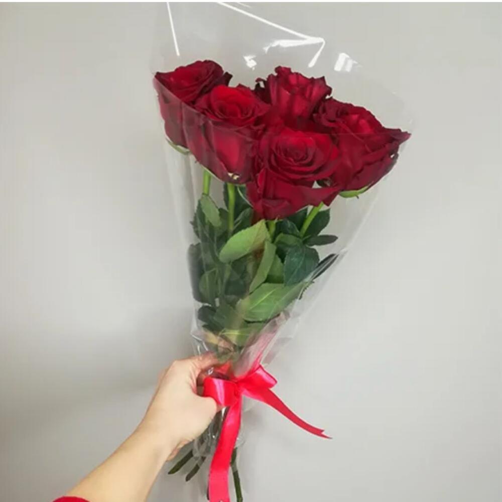 Лента атласная – 1 шт.Слюда прозрачная – 1 шт.Роза эксплорер 50 см – 5 шт.