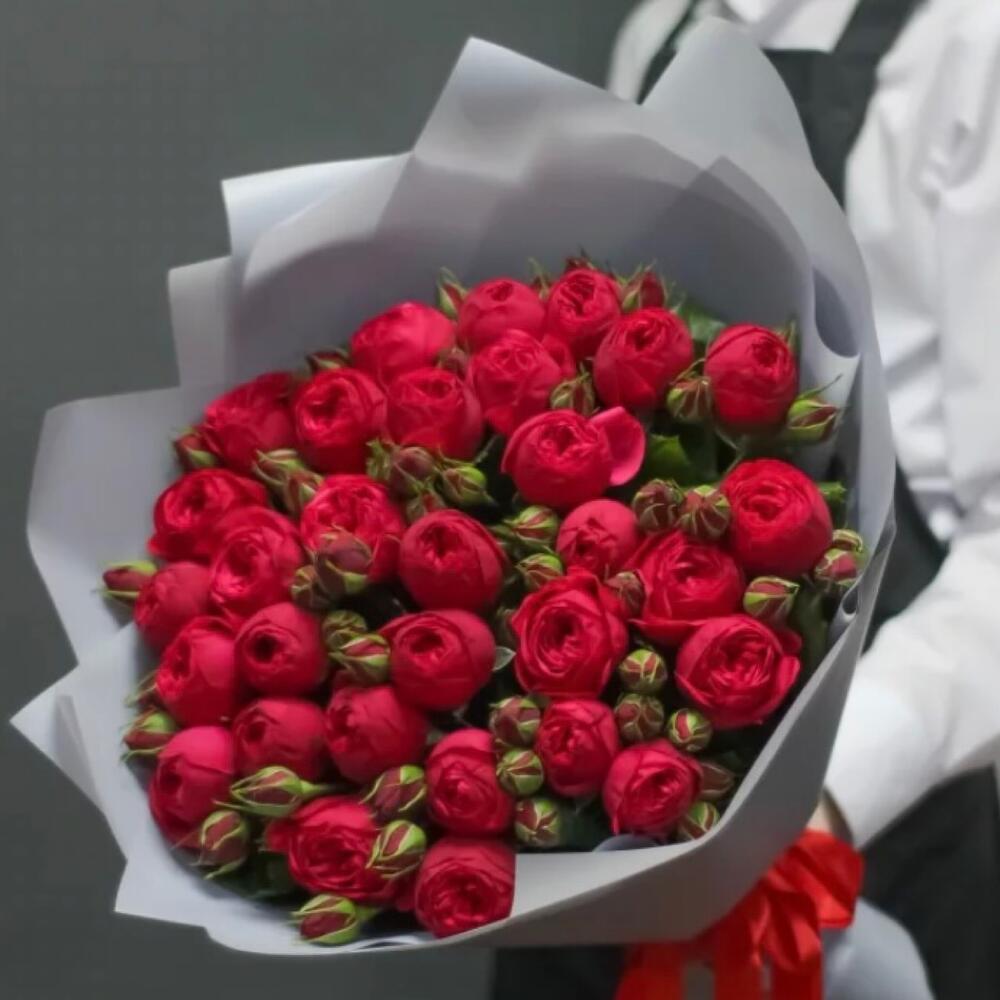 Лента атласная – 2 шт.Упаковка дизайнерская – 2 шт.Пионовидная кустовая роза – 25 шт.
