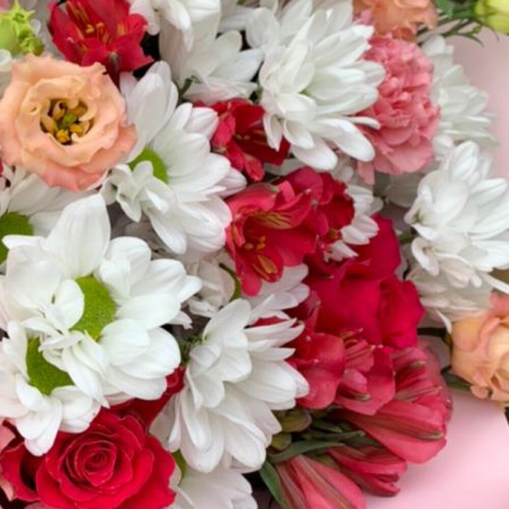 Хризантема кустовая – 5 шт.Роза – 5 шт.Альстромерия – 5 шт.Эустома – 1 шт.Гвоздика – 4 шт.Упаковка дизайнерская – 2 шт.Лента атласная – 1 шт.