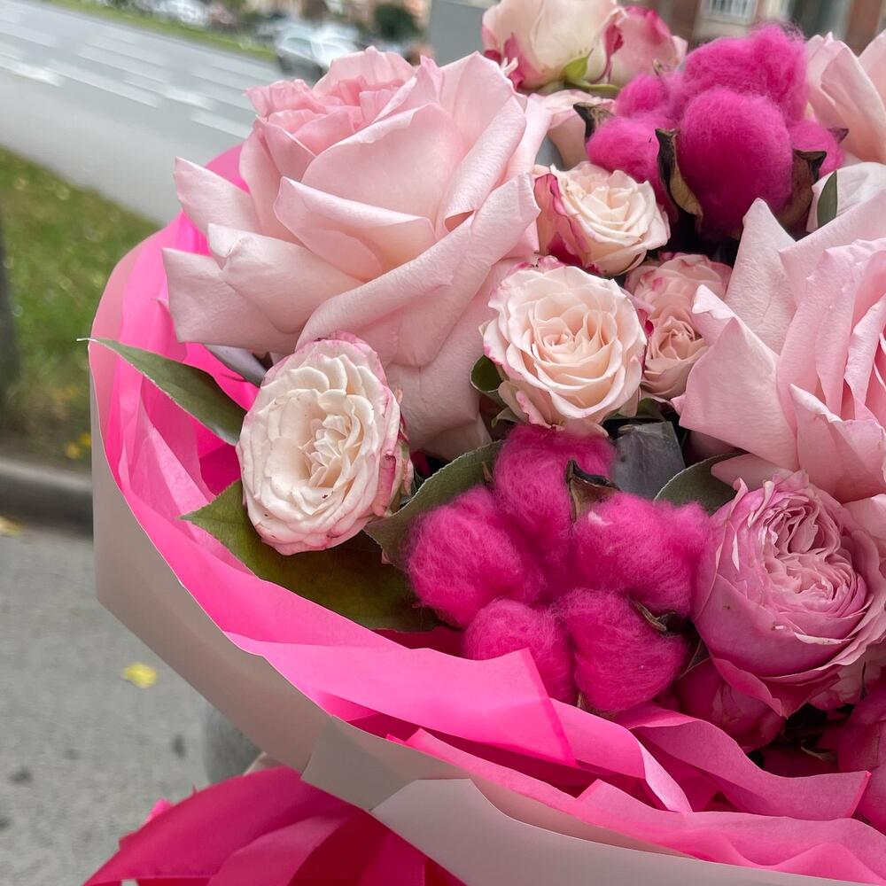 white o’hara – 3 шт.Кустовая роза – 7 шт.Пионовидная роза – 2 шт.Хлопок натуральный – 3 шт.Салал – 5 шт.Тишью – 4 шт.Пленка матовая – 1 шт.Лента атласная – 2 шт.