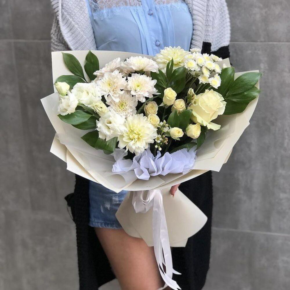 Эвкалипт – 2 шт. Оформление – 1 шт. эустома белая – 6 шт. кустовая пионовидная роза misty bubbles – 8 шт.