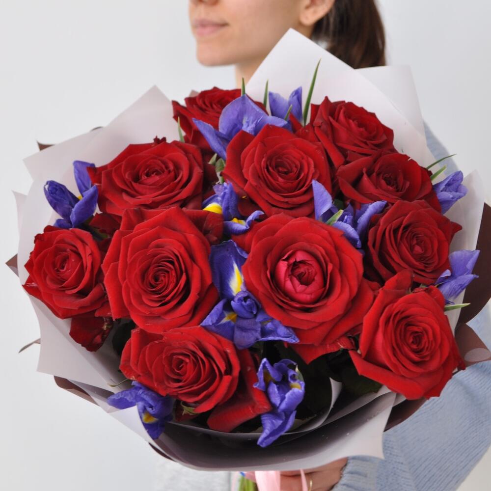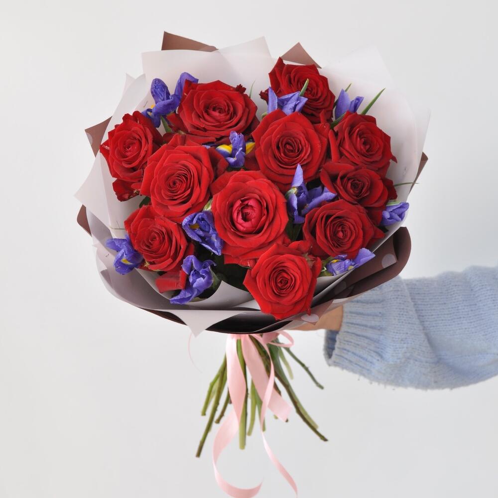 Роза красная 60 см – 11 шт.Ирис – 10 шт.Упаковка дизайнерская – 2 шт.Лента атласная – 1 шт.