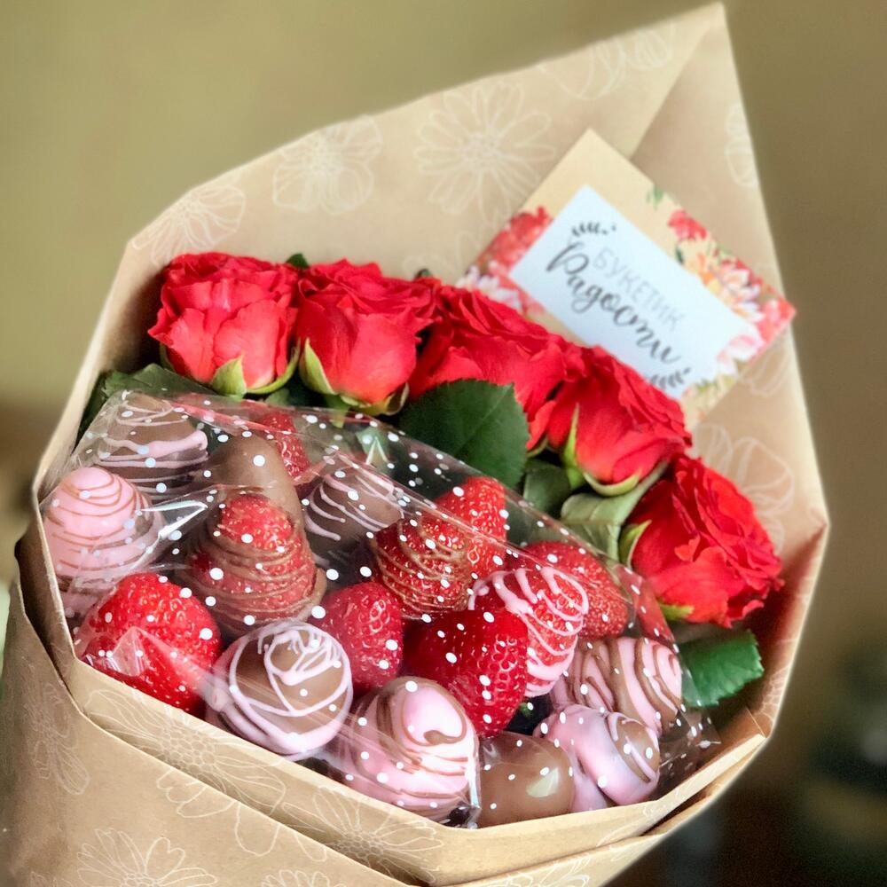 Роза – 5 шт.Упаковка дизайнерская – 1 шт.Клубника в шоколаде – 500 гр.