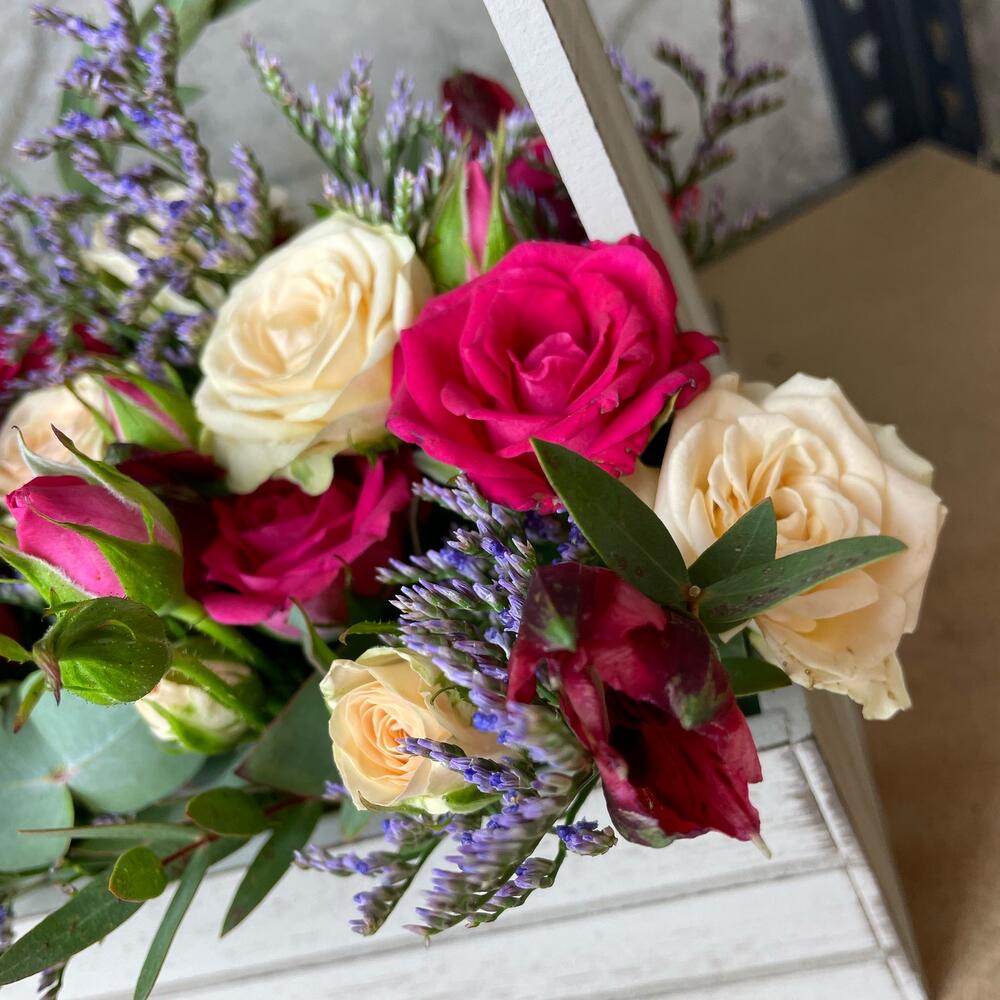 Роза кустовая – 7 шт.Эвкалипт – 3 шт.Лимониум – 3 шт.Губка флористическая – 1 шт.Ящик деревянный – 1 шт.