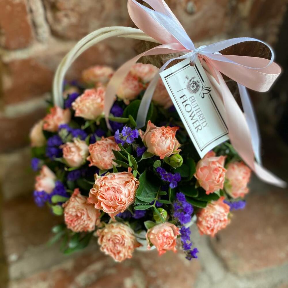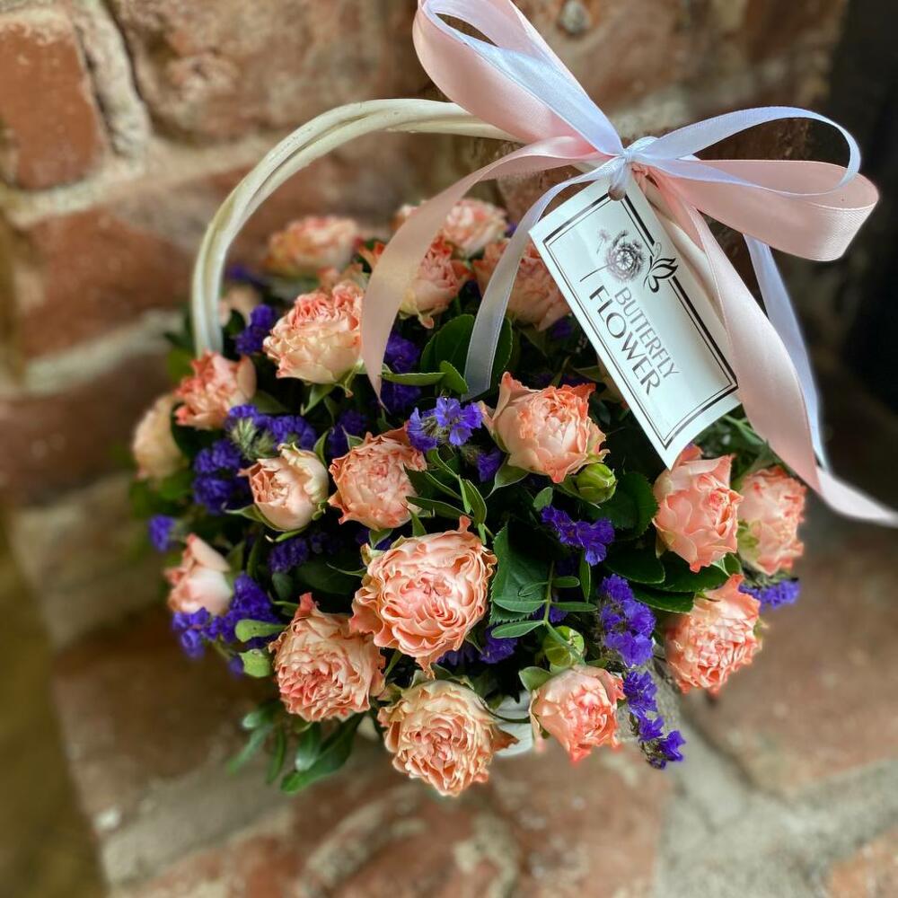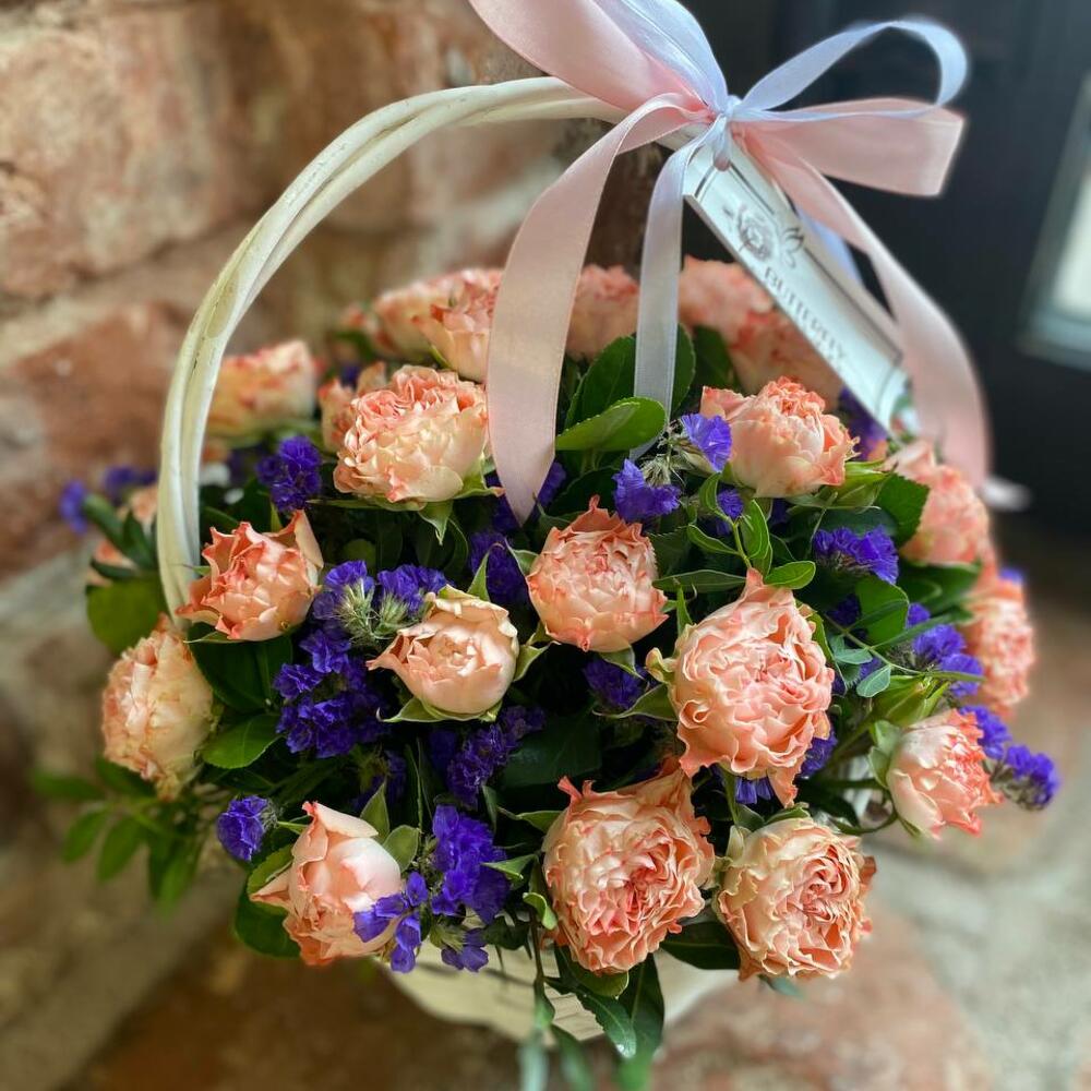 Корзина с кустовыми розами и статицей “Васильковый рассвет”