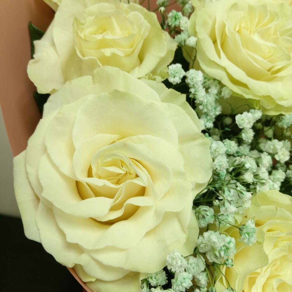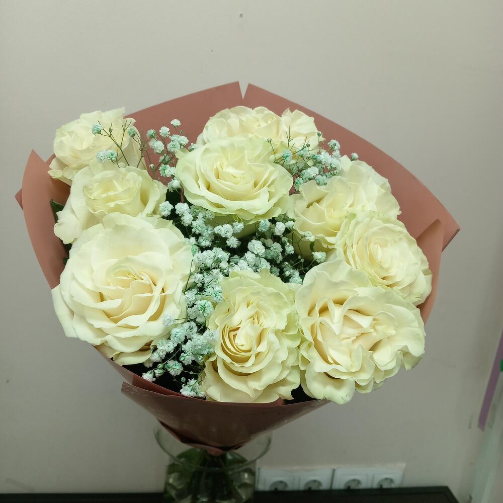 Роза эквадор 80 см – 9 шт.Гипсофила – 1 шт.Упаковка – 1 шт.