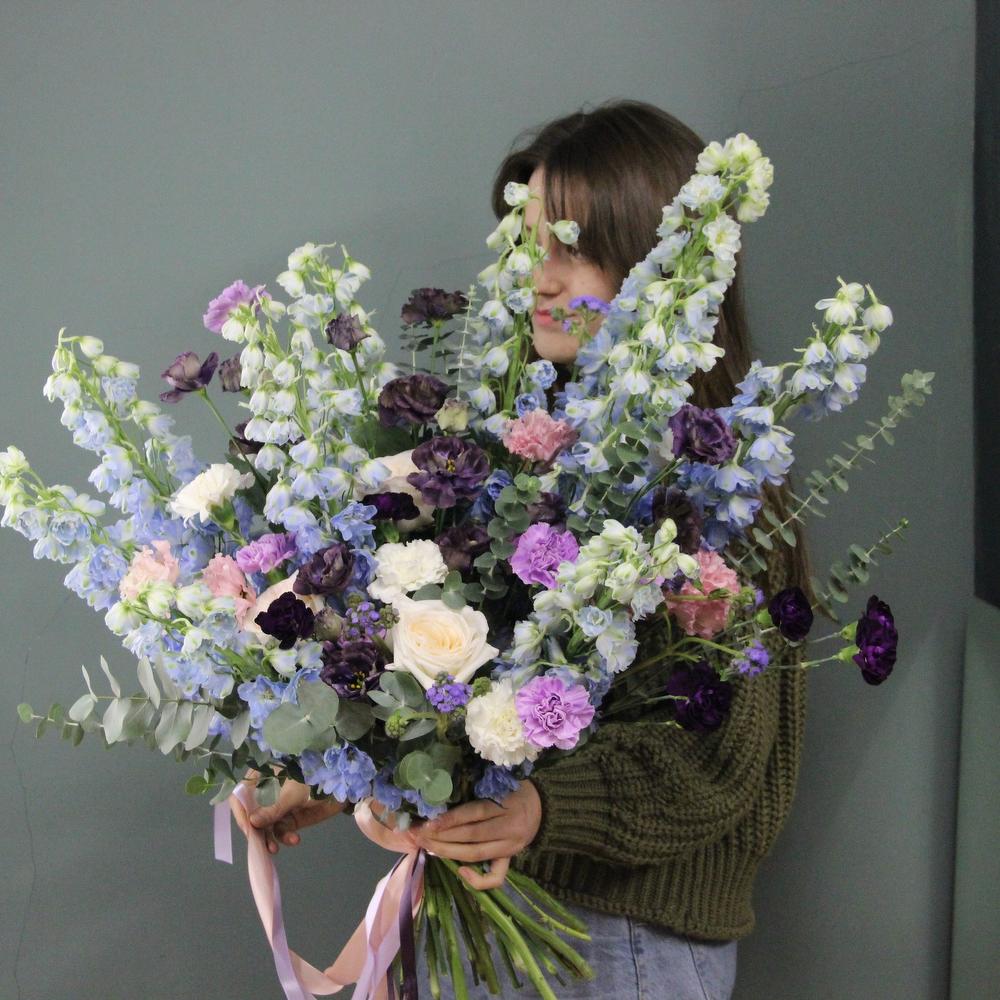 Дельфиниум – 9 шт.Лизиантус – 11 шт.Диантус – 15 шт.Роза пионовидная – 7 шт.Твидия – 5 шт.Эвкалипт – 9 шт.Фисташка – 4 шт.Лента атласная – 3 шт.