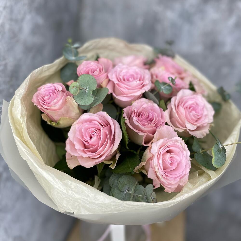 Роза – 11 шт.Эвкалипт – 2 шт.Упаковка дизайнерская – 2 шт.Лента атласная – 2 шт.