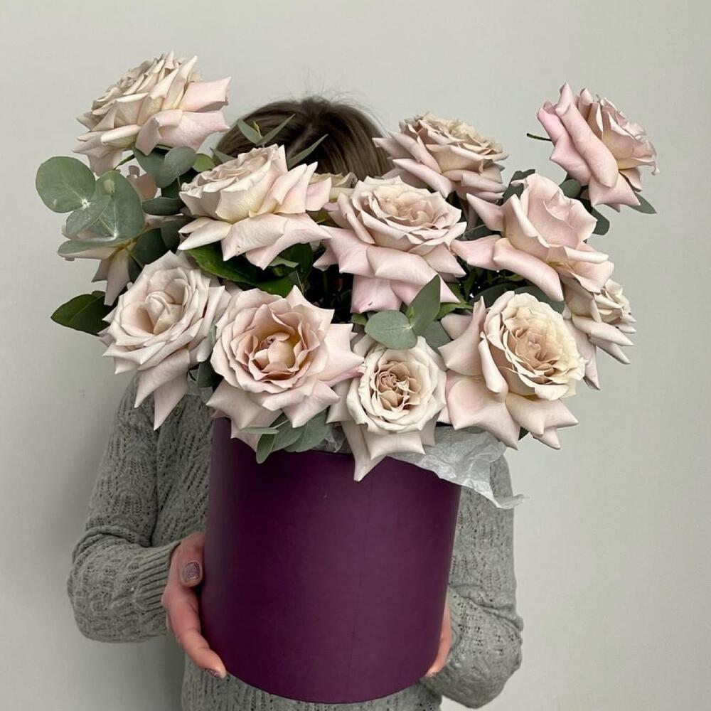 Эвкалипт – 2 шт.Роза – 15 шт.Коробка шляпная – 1 шт.Оазис флористический – 2 шт.