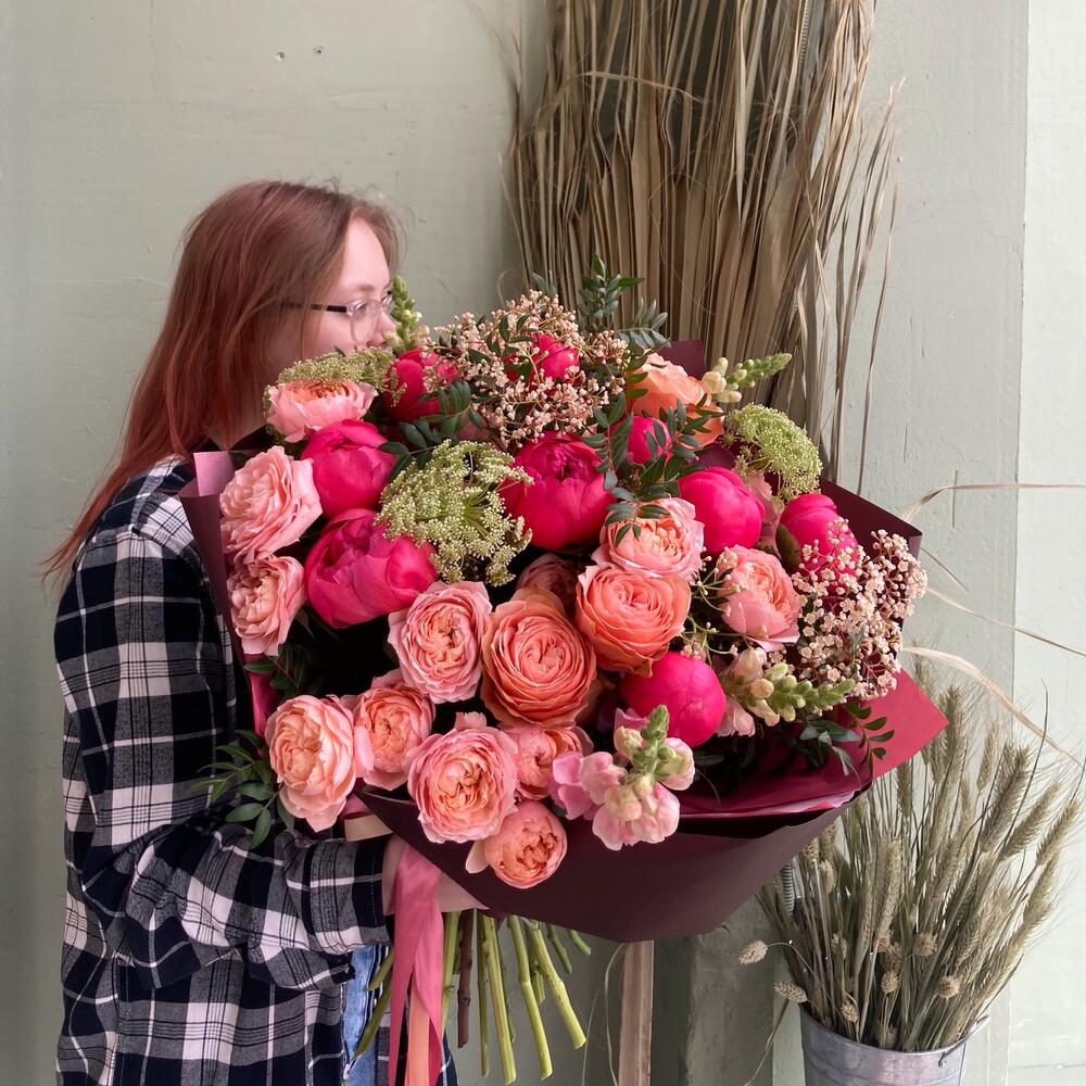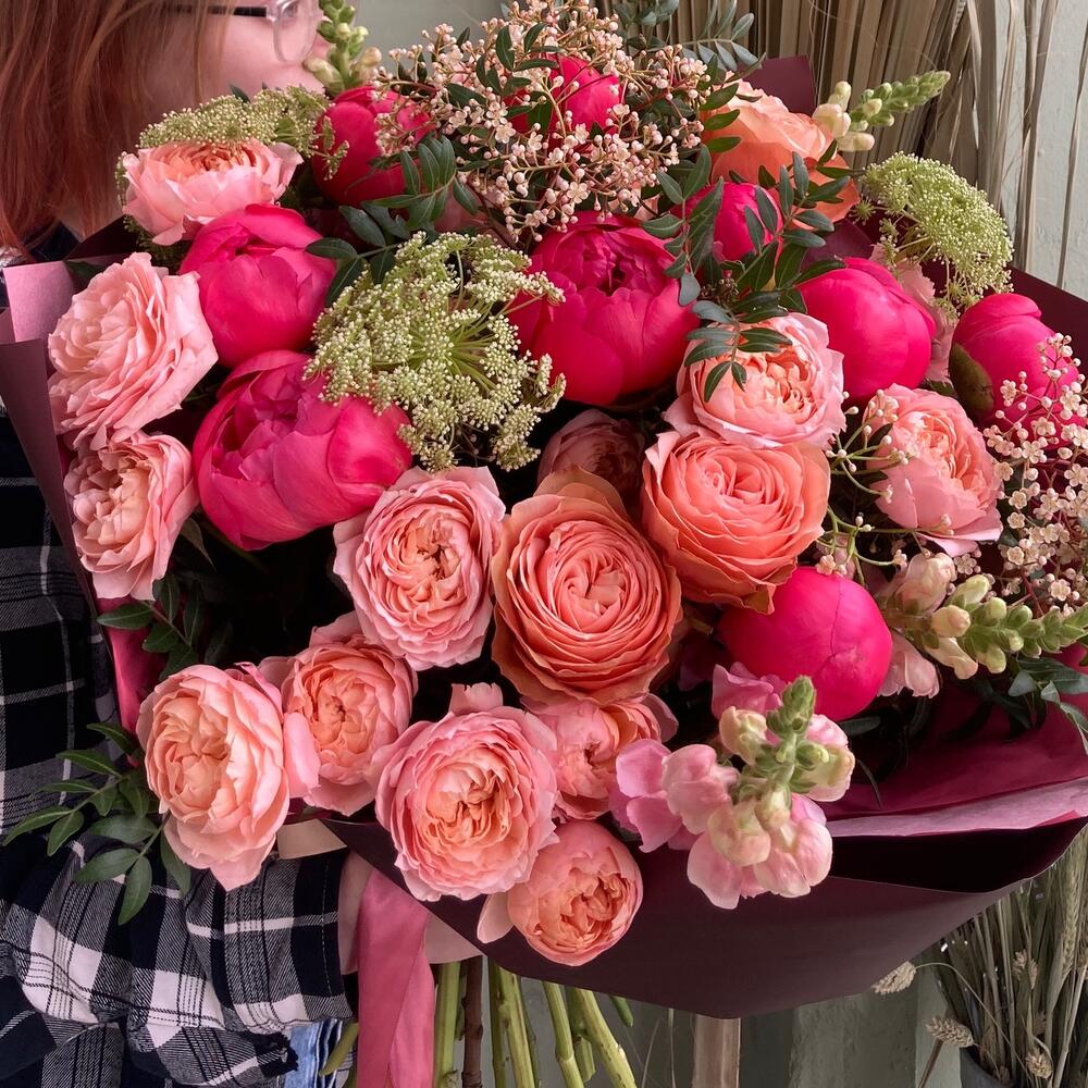 Авторский букет с пионами, пионовидными розами, львиным зевом, фатинией и зонтиками в лаконичной упаковке.Стильное цветочное решение для любого случая.