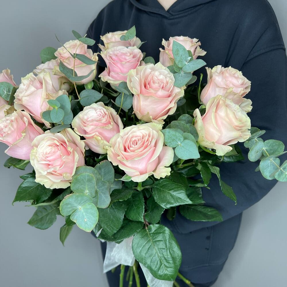 Букет из королевских стойких роз Мондиаль с ароматным эвкалиптом.
