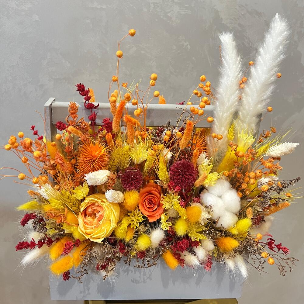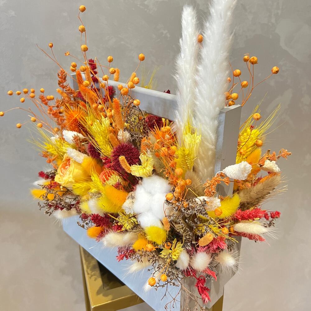 Тростник – 2 шт.Лагурус – 200 гр.Флум – 50 гр.Хлопок – 5 шт.Роза стабилизированная – 2 шт.Пшеница (сухоцвет) – 100 шт.лен сухоцвет – 30 гр.Лимониум – 50 гр.