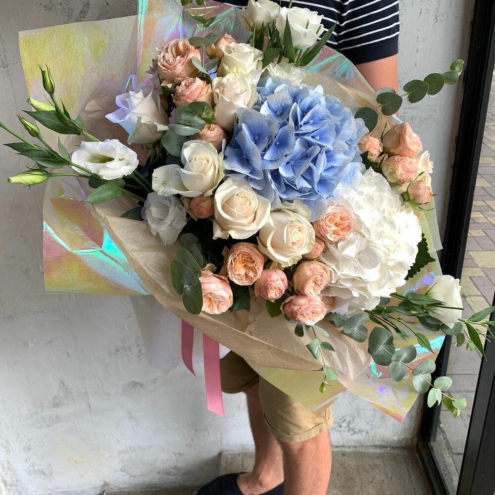 “Эвкалиптическая роскошь” гортензия и пионовидная кустовая роза