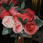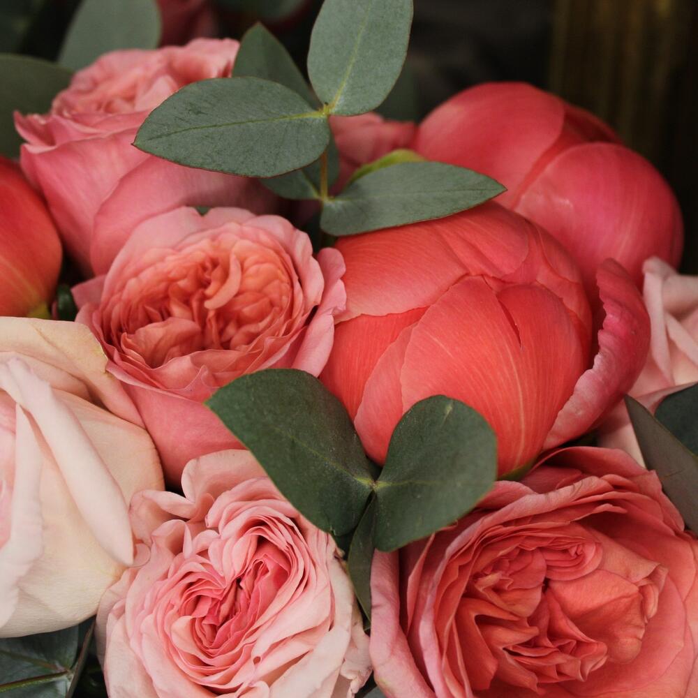 Пион коралл шарм – 3 шт.роза пинк охара(ароматная) – 3 шт.роза пионовидная пинк экспрешн – 4 шт.Лента атласная – 2 шт.Эвкалипт – 3 шт.