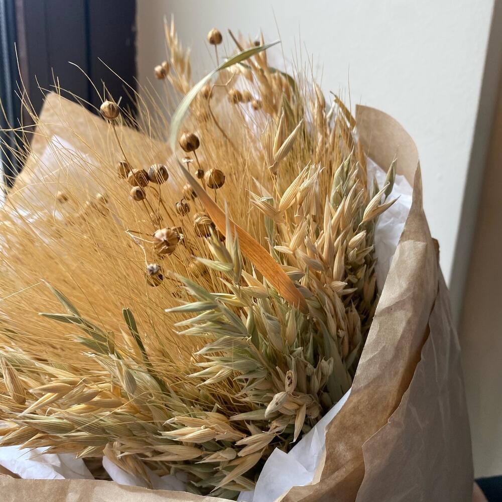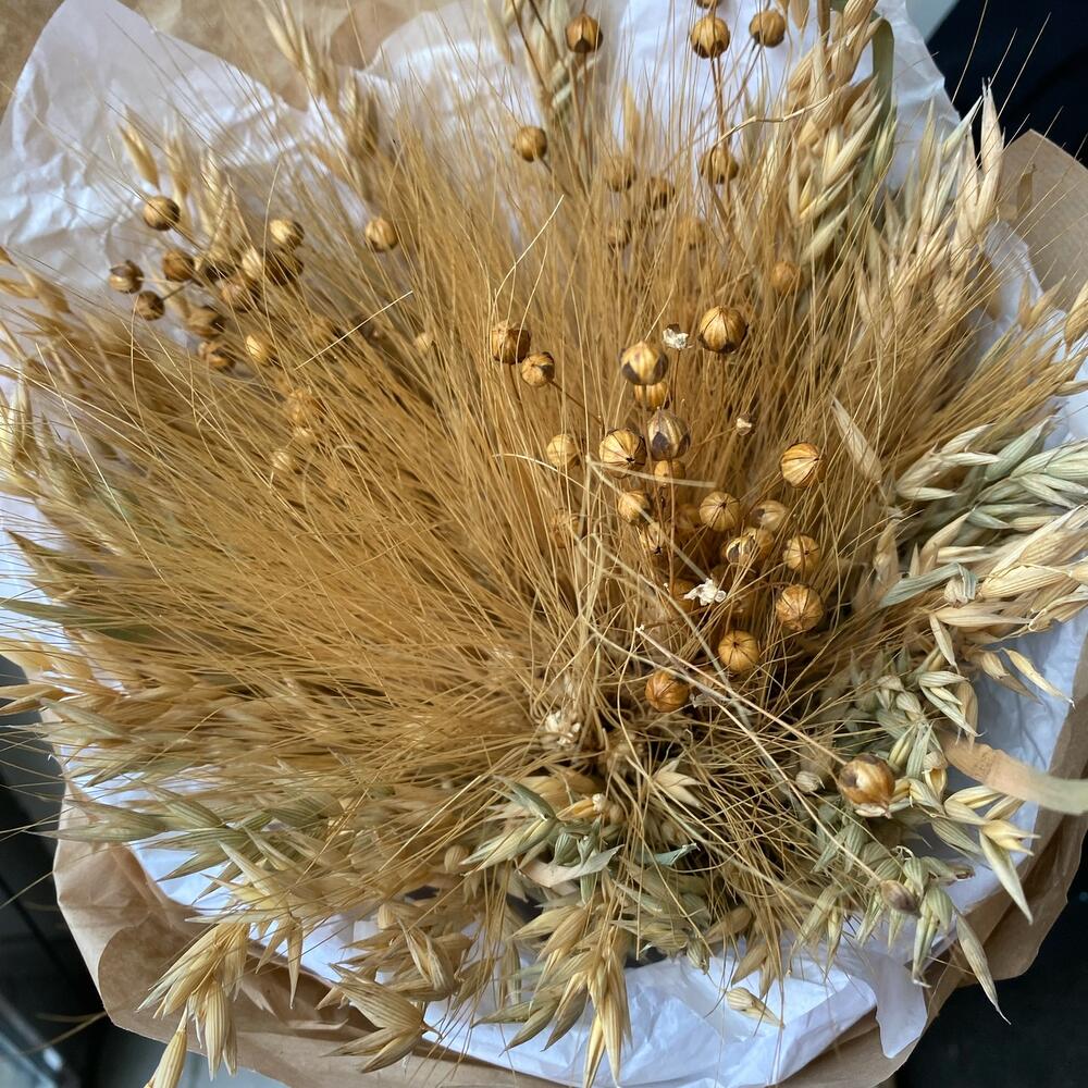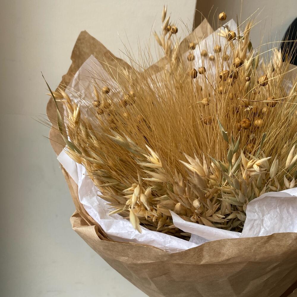 сухоцвет лен натуральный – 5 шт.овес сухоцвет – 5 шт.Пшеница пучок – 1 шт.Оформление крафт – 1 шт.