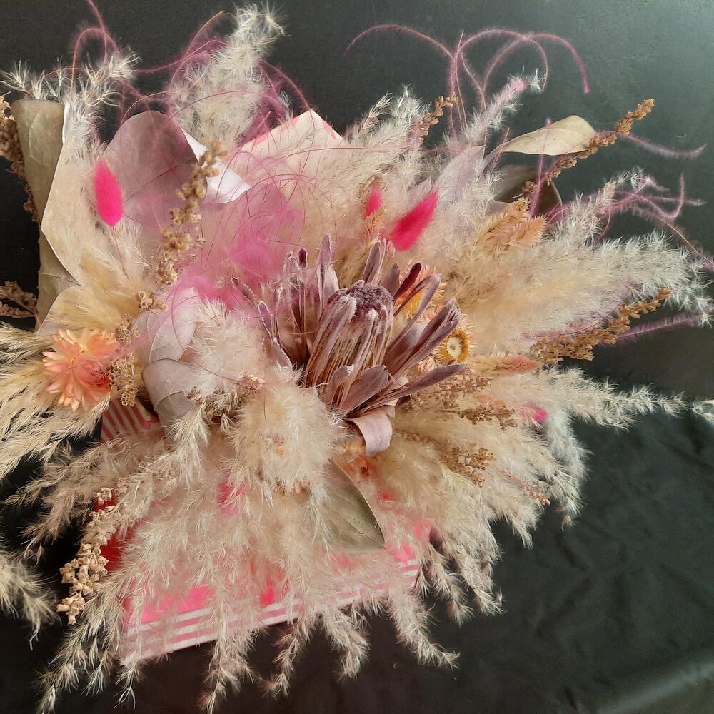 Целозия – 1 шт.Лента атласная – 6 шт.Коробка шляпная – 1 шт.Ковыль – 2 шт.Лагурус – 6 шт.Оазис флористический – 1 шт.Бессмертник – 6 шт.кортадерия – 1 шт.протея сухоцвет – 1 шт.